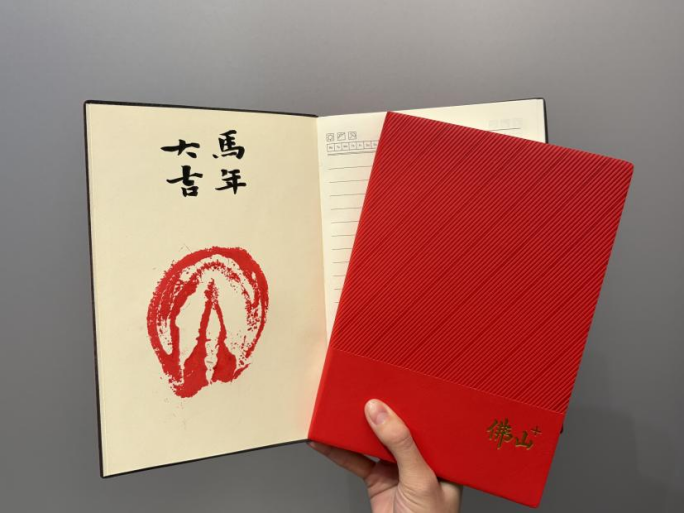 作为佛山本土知名女书法家,陈爱弟的作品多次亮相市级书法展,此次专为“小麻花”文创量身创作主题字样,以灵动行书传递新春祝福,让传统福文化在萌宠文创中焕发新生。而更具收藏价值的“佛山+专属笔记本”,则将稀缺感拉满:封面拓印着“小麻花”清晰可触的马掌纹路,凹凸质感尽显匠心;内页嵌入少量的天然马毛,每一本都是不可复制的孤品。