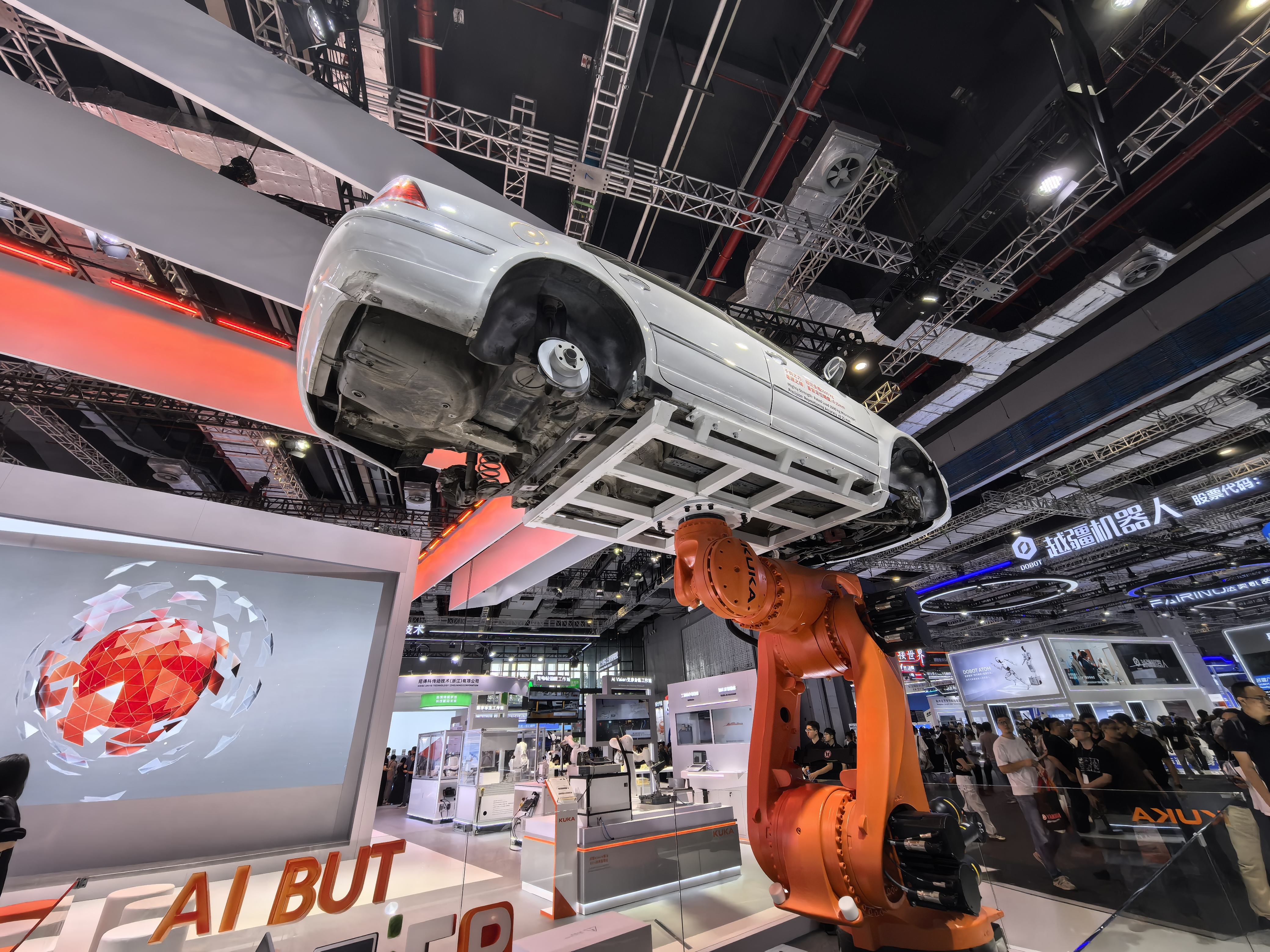 中国工博会上,库卡重载机器人举起一台轿车。