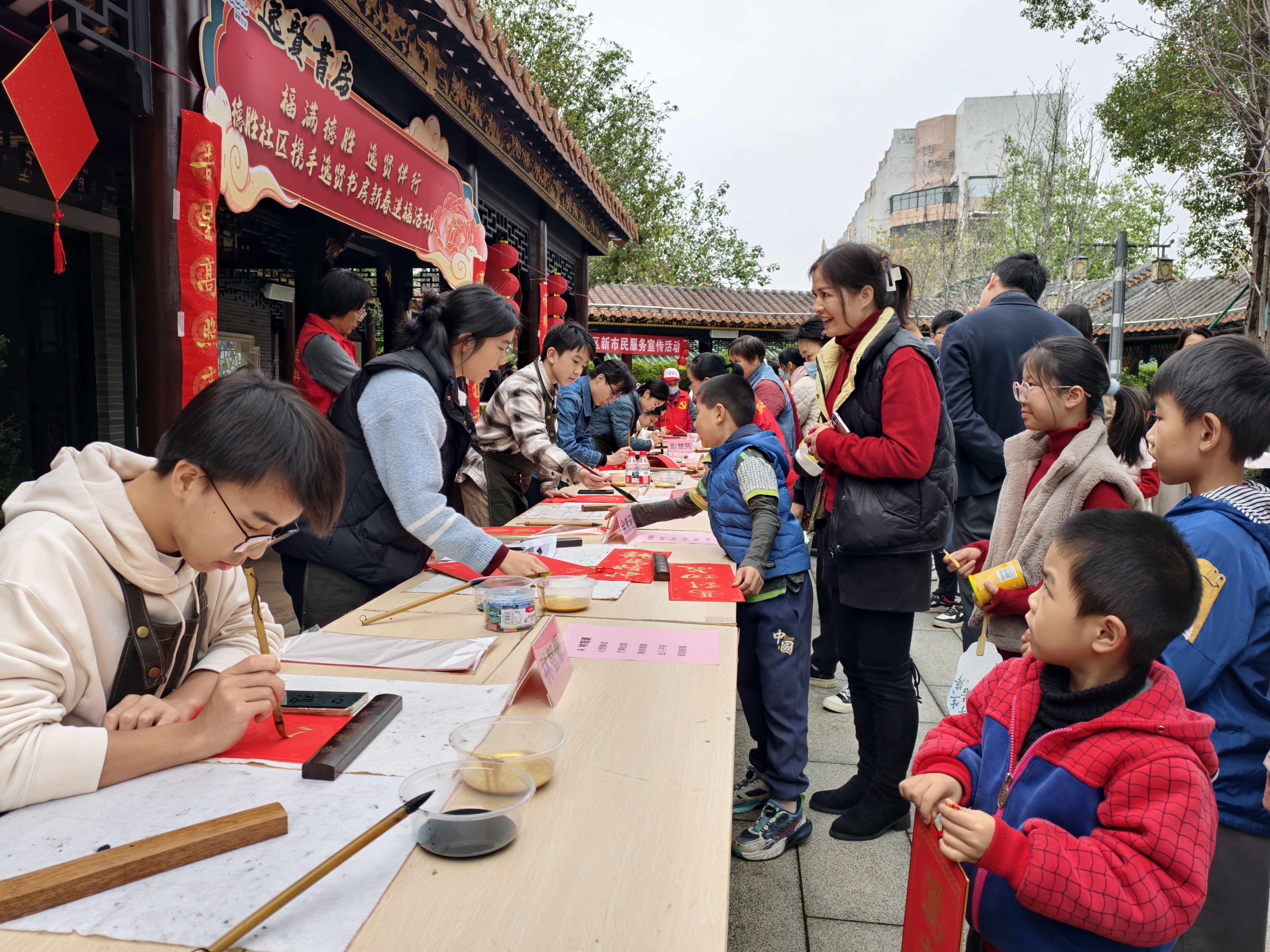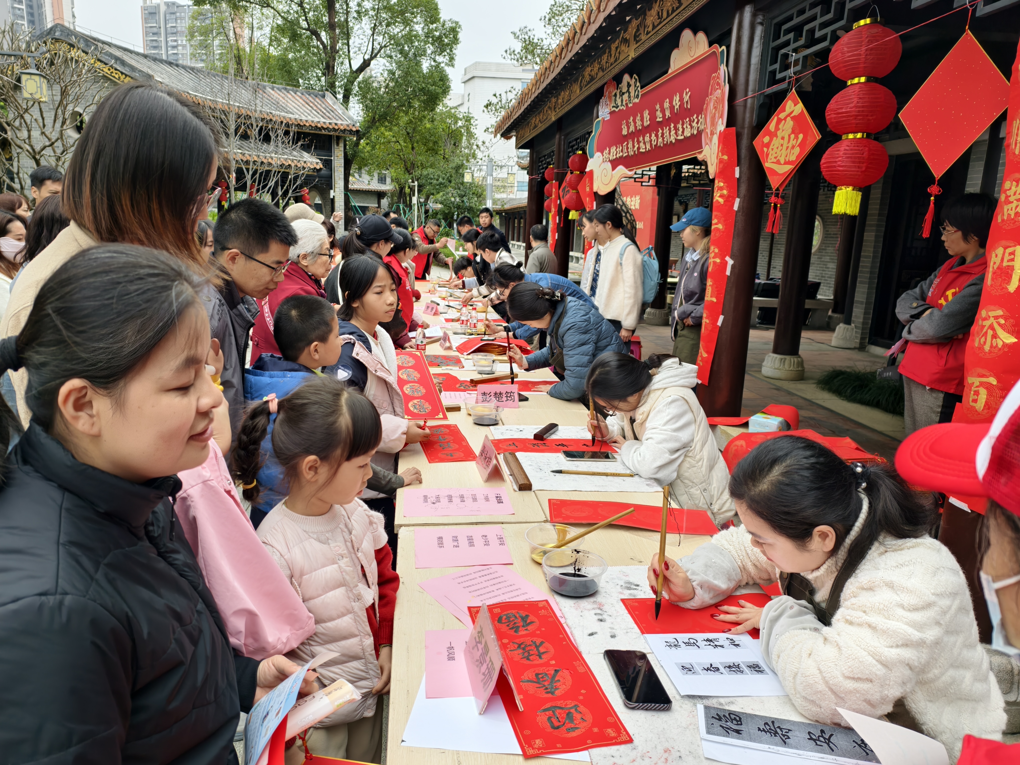 活动现场最热闹的区域,当属新春送福与非遗体验区。本次新春送福活动由德胜社区携手逸贤书房共同开展,广东省书法家协会会员、顺德区青年书法家协会理事、逸贤书房负责人周贤聪携7位学员现场挥毫,一幅幅充满年味的福字、一副副寓意吉祥的春联跃然纸上。职工、居民争相领取这份墨香满满的新春祝福,欢乐祥和的氛围和雅致的岭南园林相得益彰。