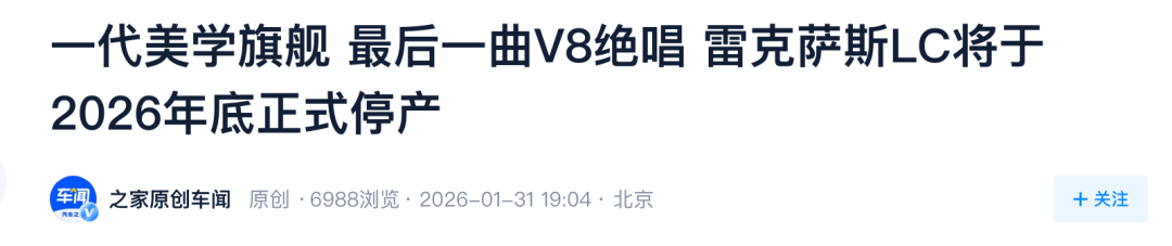 据媒体报道,雷克萨斯LC 500车型将于2026年底正式停产,而500h混动版车型已于去年正式停产。据称,其替代车型将于2030年左右推出,可能与下一代丰田GR SUPRA基于相同的平台打造。