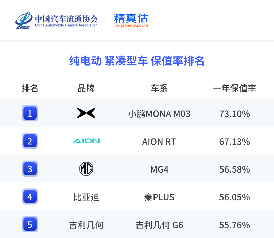 纯电动紧凑型车中,小鹏MONA M03一年保值率为73.10%,埃安AION RT为67.13%,其他车型包括名爵MG4、比亚迪秦PLUS、吉利几何G6均低于60%。纯电动中型车中,特斯拉Model 3一年保值率为75.27%,五菱星光、荣威D7、深蓝L07、比亚迪海豹也均在60%以上。