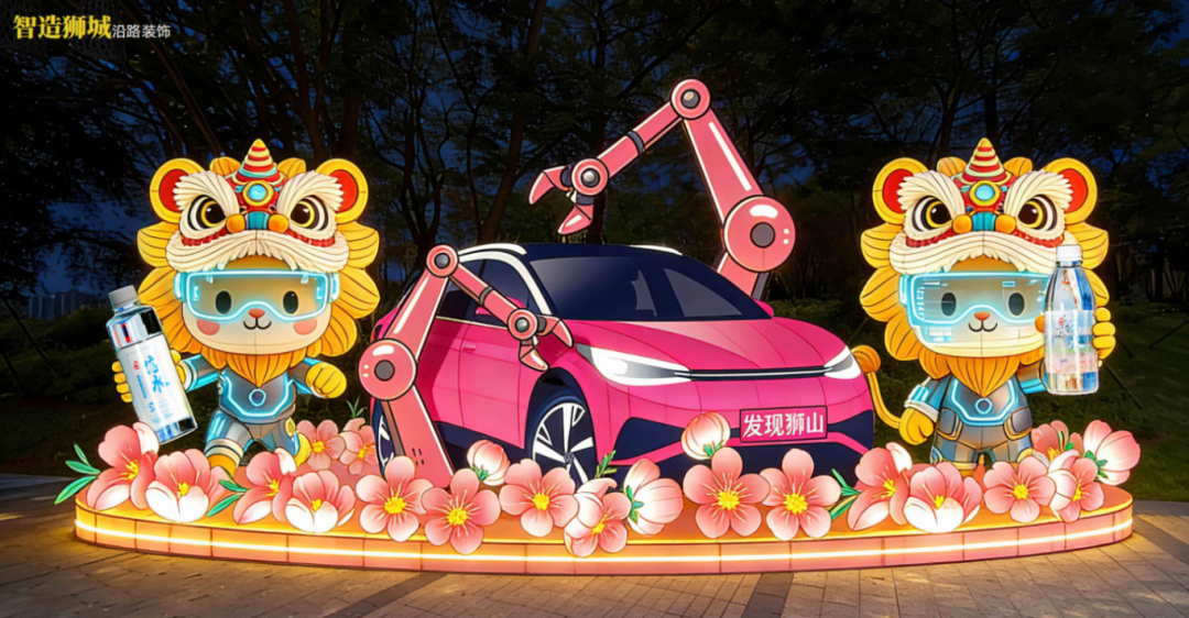 “智造狮城”灯组里的两只萌趣机甲醒狮来头不小,是国赛获奖佳作,设计感与创意感拉满;它们戴着VR眼镜,手持“掂水”标识,科技感满满;身旁的汽车造型灯组,仿佛是产业工人用智慧与汗水拼出的新春礼物,尽显狮山作为智造强镇的硬核实力。