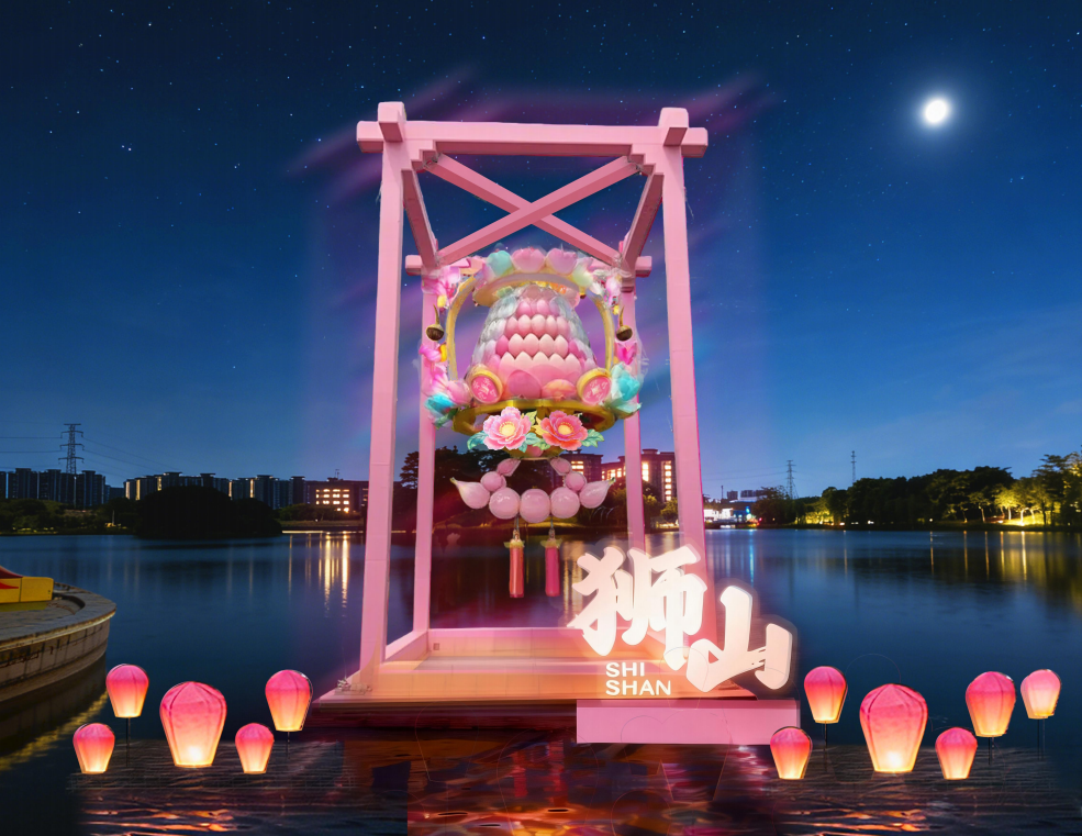 作为狮山“产城人文”融合的文旅新IP,本届灯会将非遗传承与创新设计完美融合。13组主题大灯分布博爱湖“城市客厅”,每一盏灯都承载着独特的文化内涵与创意巧思,将300余年乐安花灯非遗技艺,与狮山产业活力、城市肌理、人文底蕴相融,把“中国好创意暨全国数字艺术之共享美色设计大赛”获奖作品以传统灯艺在地呈现。