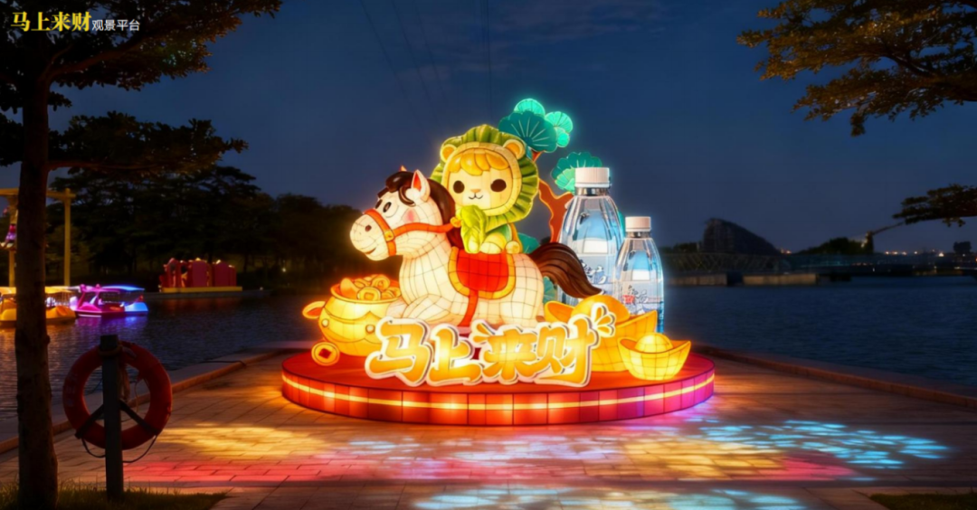 值得一提的是,灯组制作全程坚持“在地创作”,融入狮山本土生菜、城市建筑等元素,更将“中国好创意暨全国数字艺术之共享美色设计大赛”获奖作品以传统灯艺实体呈现。如“马上来财”灯组以狮山镇官窑生菜会的生菜为创作原型,造型别致又具地域特色。萌狮头戴卡通生菜头像,憨态可掬,骑着矫健的小马,背上还驮满了金灿灿的金元宝,巧用粤语“以水为财”的谐音,传递着“马上生财”的美好祝愿。3.5米高的灯组造型十分醒目,流光灯效的线条搭配绚烂的烟花灯,灯光闪烁间尽显富贵吉祥。