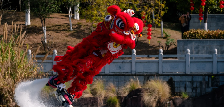 表演内容:表演者们将踩着特制的水上浮台,操控狮头腾跃、翻滚,时而如蛟龙出海破水而出,时而似猛虎下山威风凛凛。
