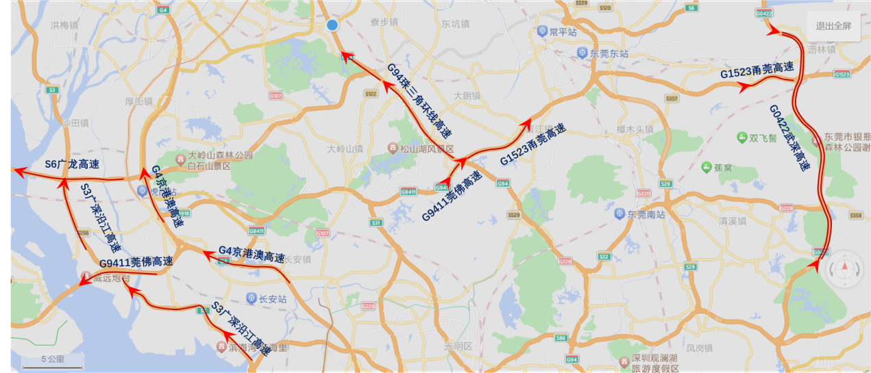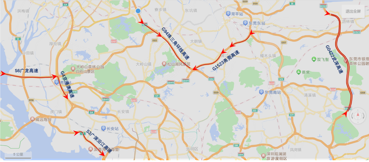 根据预测,出程易拥堵缓行的高速路段是:广龙高速(S6)东莞往广州方向南沙大桥路段;莞佛高速(G9411)东莞往广州方向虎门大桥路段;广深沿江高速(S3)深圳往广州方向长安至威远立交路段、沙田立交路段;京港澳高速(G4)深圳往广州方向长安至五点梅立交路段、虎门至广龙高速厚街互通立交路段;博深高速公路与潮莞高速公路互通立交北行路段;莞佛高速(G9411)松山湖站-大有园互通立交段;甬莞高速(G1523)大有园互通立交-莞樟路站段、谢岗站-冷水坑隧道段;珠三角环线高速(G94)大有园互通立交-大朗段、中心站-石大站段;从莞高速公路与广龙高速立交互通路段;武深高速公路谢岗服务区路段;广龙与莞深互通路段。预计上述路段因节假日集中出行车流量大容易形成交通瓶颈、继而出现行车缓慢、拥堵情况。