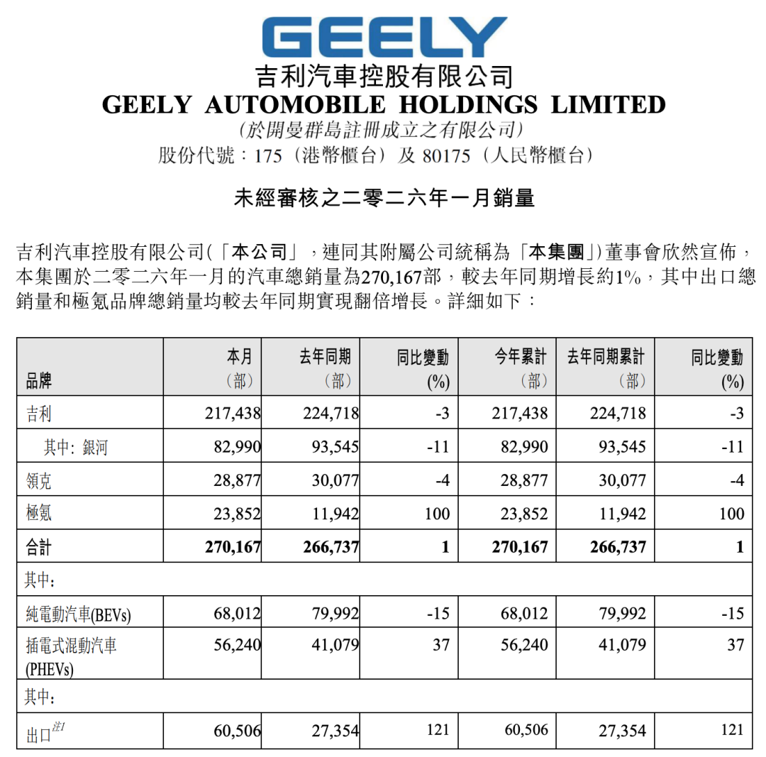 2月1日,吉利汽车控股有限公司(下称“吉利汽车”)公布最新销量数据。数据显示,1月吉利汽车乘用车销量为270,167辆,同比增长1%。其中,新能源汽车销量(含吉利银河品牌、领克品牌、极氪品牌)为124,252辆,同比增长3%。海外市场销量为60,506辆,同比增长121%。