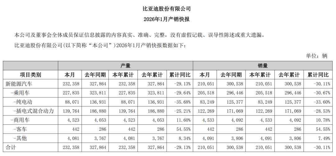 据比亚迪股份有限公司(下称“比亚迪”)公布的数据显示,1月比亚迪汽车销量为210,051辆,同比下滑30.11%,其中比亚迪乘用车销量为205,518辆,同比下滑30.67%,纯电动车销量为83,249辆,同比下滑33.60%,插电式混合动力销量为122,269辆,同比下滑28.53%。数据显示,1月比亚迪新能源汽车出口100,482辆,也就是国内销量为109,569辆。据了解,比亚迪已经多月销量持续下滑。