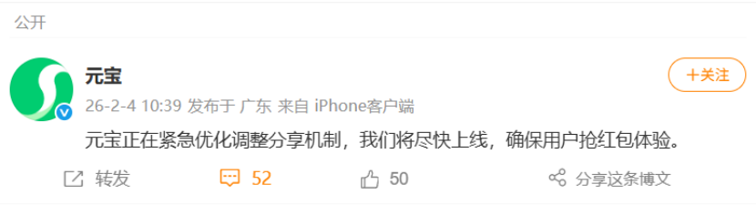 面对处置,双方迅速做出回应。微信方面明确表示,将持续监控春节营销活动,依据规则保障用户体验,不因产品归属而放宽标准;元宝方面则紧急表态,称正在优化调整分享机制,承诺尽快上线合规版本,并在互动中以 “微信说我太热情了” 的幽默表述缓解舆论压力。