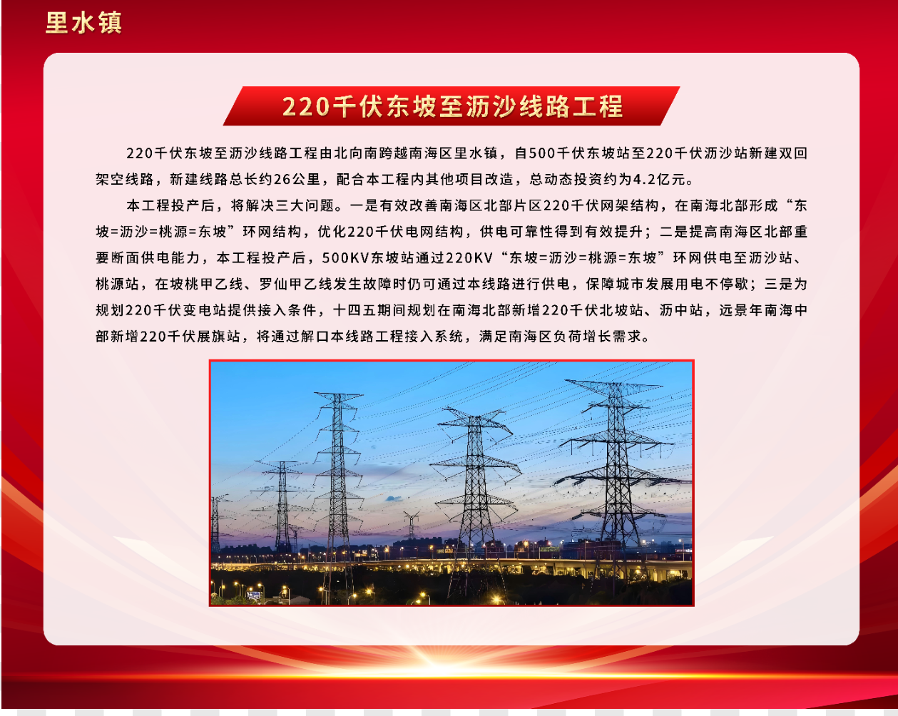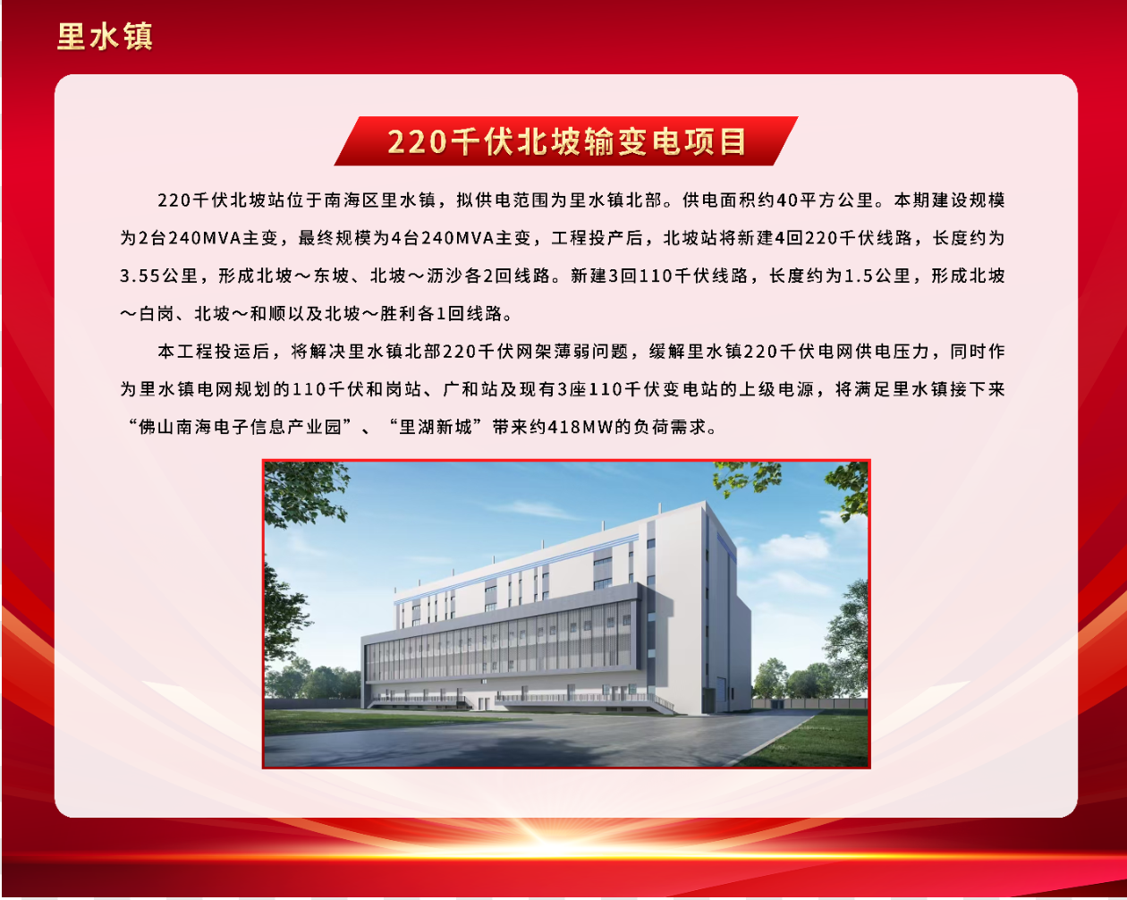 记者从里水镇了解到,里水电网建设提速,作为南海东部电网“生命线”的220千伏东坡—沥沙线路工程106个塔基交付率已超九成,预计春节前完成交付,创下南海区历年最快速度,全面筑牢区域供电安全屏障,220千伏北坡变电站将同时投产。110千伏朝阳变电站预计2026年9月投产,三大工程的投运,将可解决南海东部镇街的用电“卡脖子”难题。