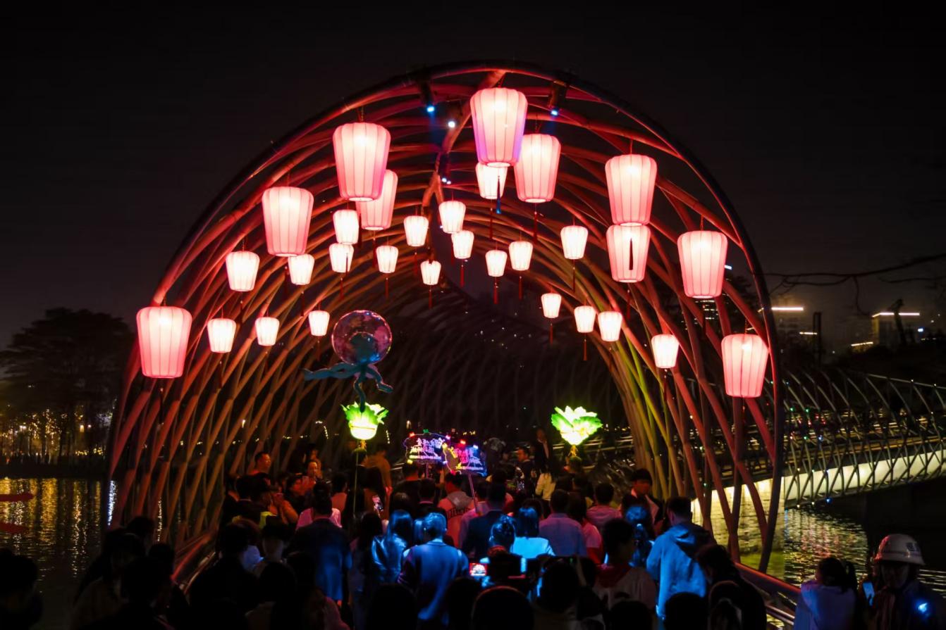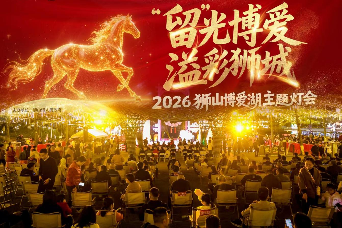 随着花灯的点亮,“享狮山 过大年”2026狮山新春文体旅系列活动同步上线。除博爱湖主题灯会外,五大迎春花市、狮王争霸赛、烟花汇演等民俗活动轮番上演;南海影视城、航天科技体验中心等景点成为亲子出游首选;和信、万民等商圈促消费活动与人气餐饮福利同步发力,让市民在品民俗、观盛景、逛商圈、耍文化中欢度新春。
