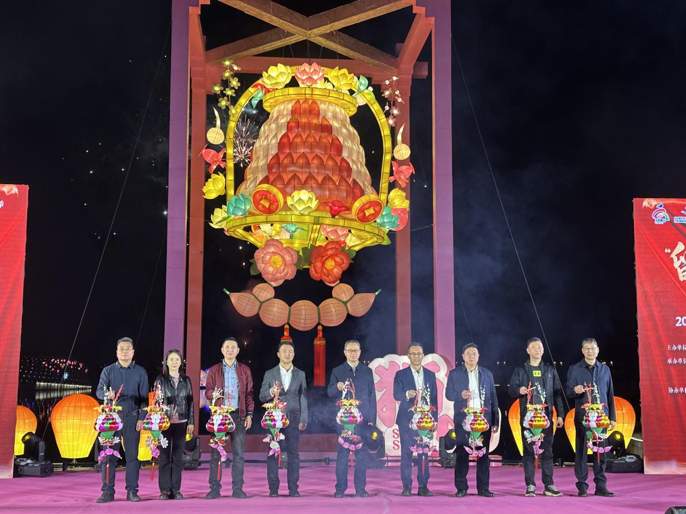 亮灯仪式上,随着冷烟花绽放,东草坪广场水岸世界最大乐安花灯点亮,十三个灯组逐步亮起,博爱湖畔瞬间流光溢彩、美不胜收。