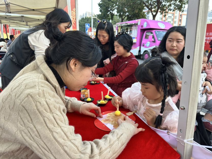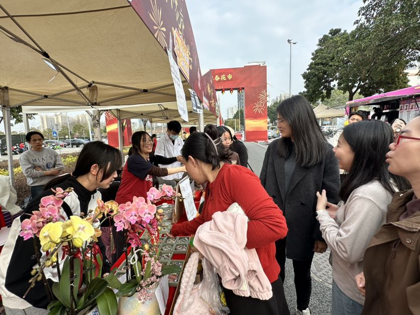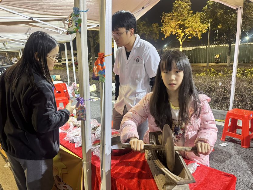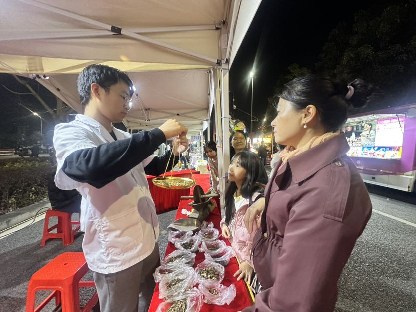 “免费猜拳,赢了送一串鱼蛋,输了买一串!”此起彼伏的吆喝声里,第四小组的咖喱鱼蛋摊前排起小长队,趣味互动让摊位人气爆棚。另一边,中草药香囊摊前,摊主正细心讲解安神香囊的用法;拓印新春扇子摊前,市民亲手印制专属年味;吴屋村番薯、萝卜等本土农产品摊位,凭借地道风味吸引不少“回头客”。从下午到入夜,5个创业小组各展所长,茶饮、自制凉粉、兰花等好物接连售出,用实打实的成绩交出创业实践的亮眼答卷。
