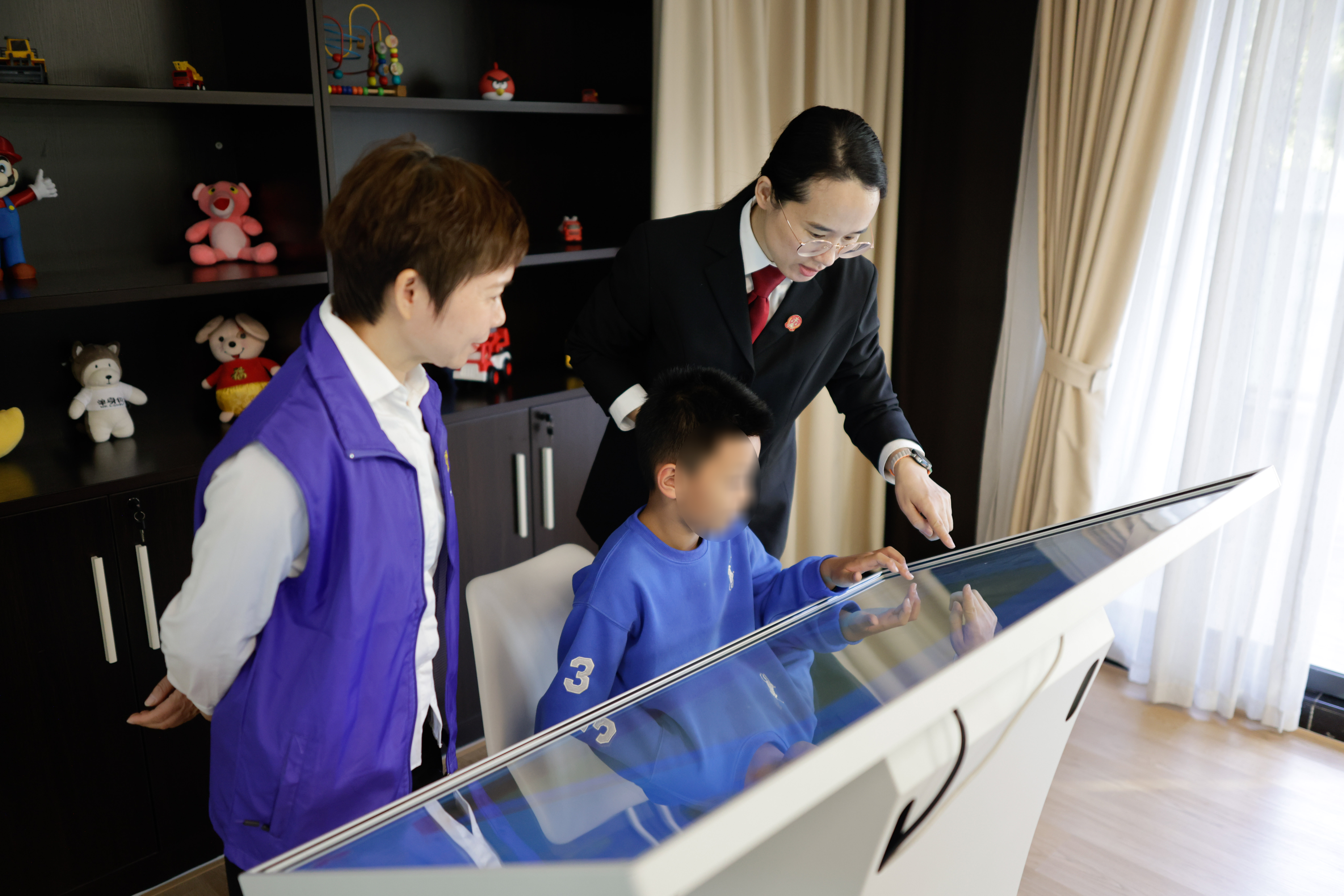 法官通过电子沙盘快速了解孩子心理状态/南海法院供图。