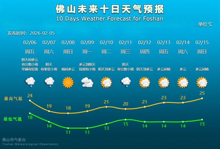 佛山市气象台2月5日预报,6日阴天间多云,有分散小雨,早晨有轻雾,气温18℃~24℃;7日(周六)阴天,有零星小雨,气温14℃~19℃;8日(周日)晴间多云,11℃~18℃,适宜洗晒;9日多云到阴天,局部有小雨,气温11℃~19℃;10日阴天到多云,气温13℃~21℃。