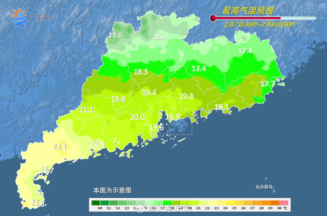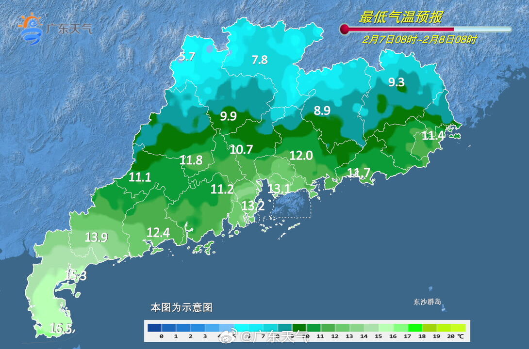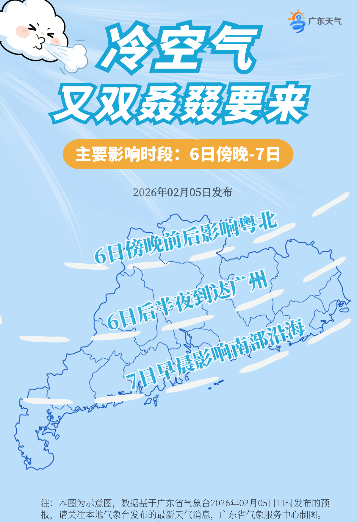 据广东省气象台2月5日预报,这股冷空气将于6日傍晚前后开始影响粤北,6日后半夜到达广佛等中部地区,7日早晨抵达南部沿海,部分市县伴有小雨;省内各地过程降温幅度:中北部下降6℃~9℃,南部下降3℃~5℃;过程最低气温出现在8日或9日早晨,粤北部分市县有5℃以下低温,高海拔山区1℃~3℃,局部有霜(冰)冻。10日起,省内各地气温逐渐回升。