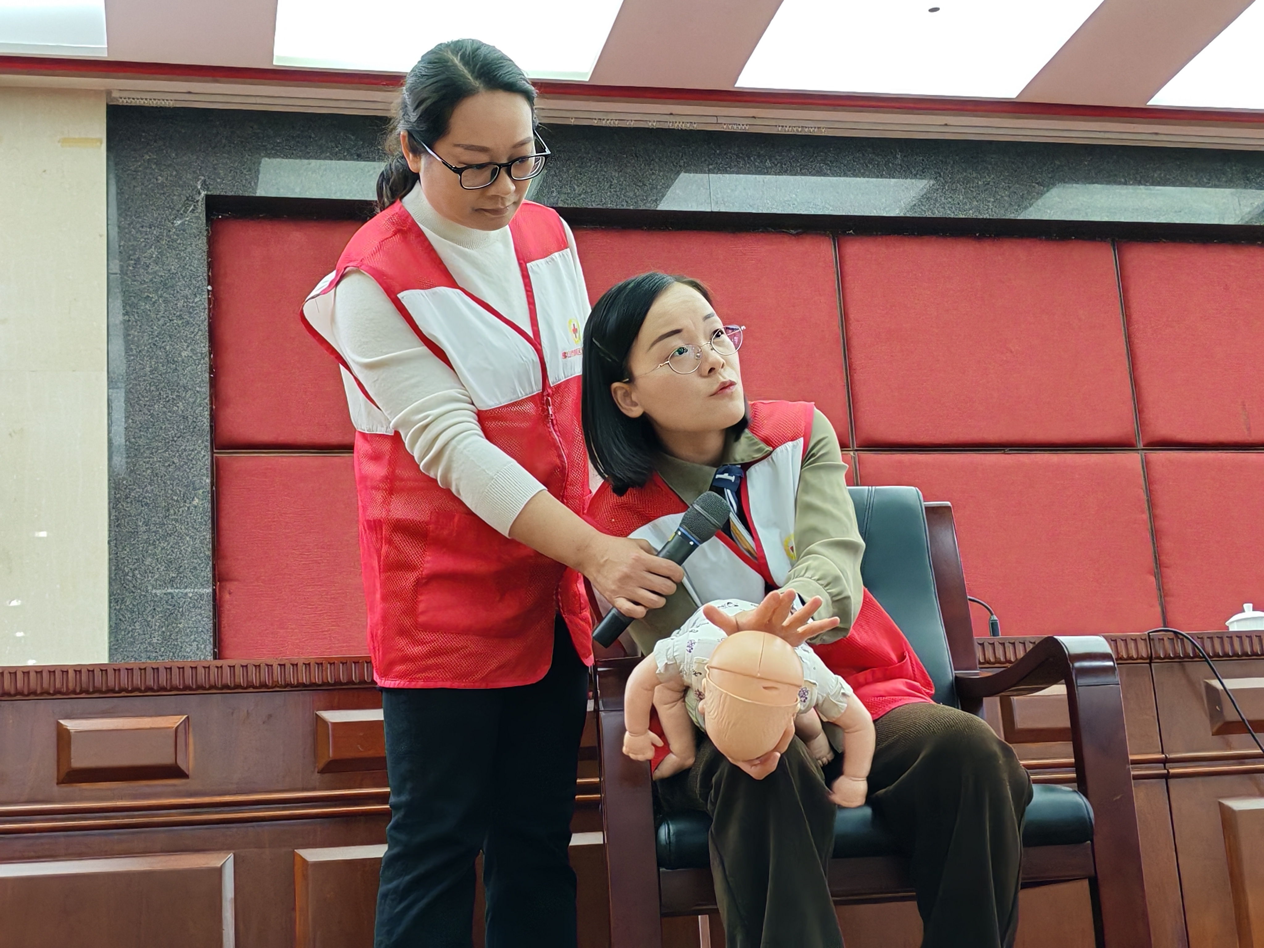 在高明区应急救护培训班,特邀高明区慢性病防治站副主任医师、高明区红十字会应急救护培训讲师区俏影(右)开展培训讲座。