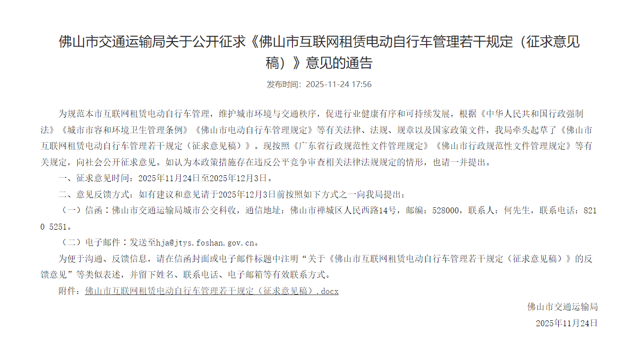 针对乱象,治理已在路上。去年11月,佛山市交通运输局就《佛山市互联网租赁电动自行车管理若干规定(征求意见稿)》公开征求意见。新规拟对共享电动自行车实行“总量控制、动态管理”,要求运营企业签订服务协议,明确停放管理、车辆维护、客服响应等责任。