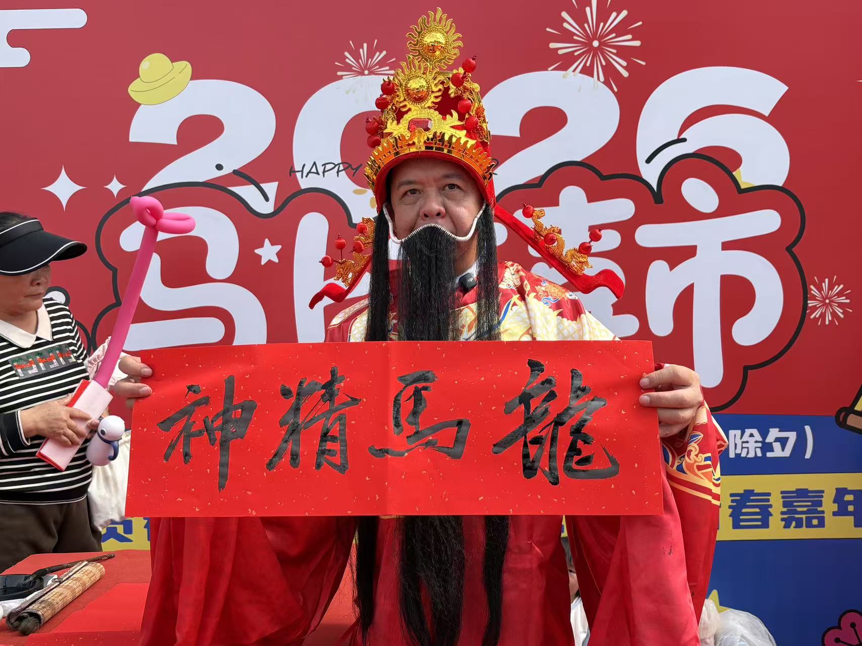 笔墨迎春,福气到家。身着财神服饰的书法老师现场挥毫,一幅幅寓意吉祥的春联被赠予往来市民。“财神送福,龙马精神”,传统书法与年节仪式相结合,为市集增添了浓浓的文化气息。