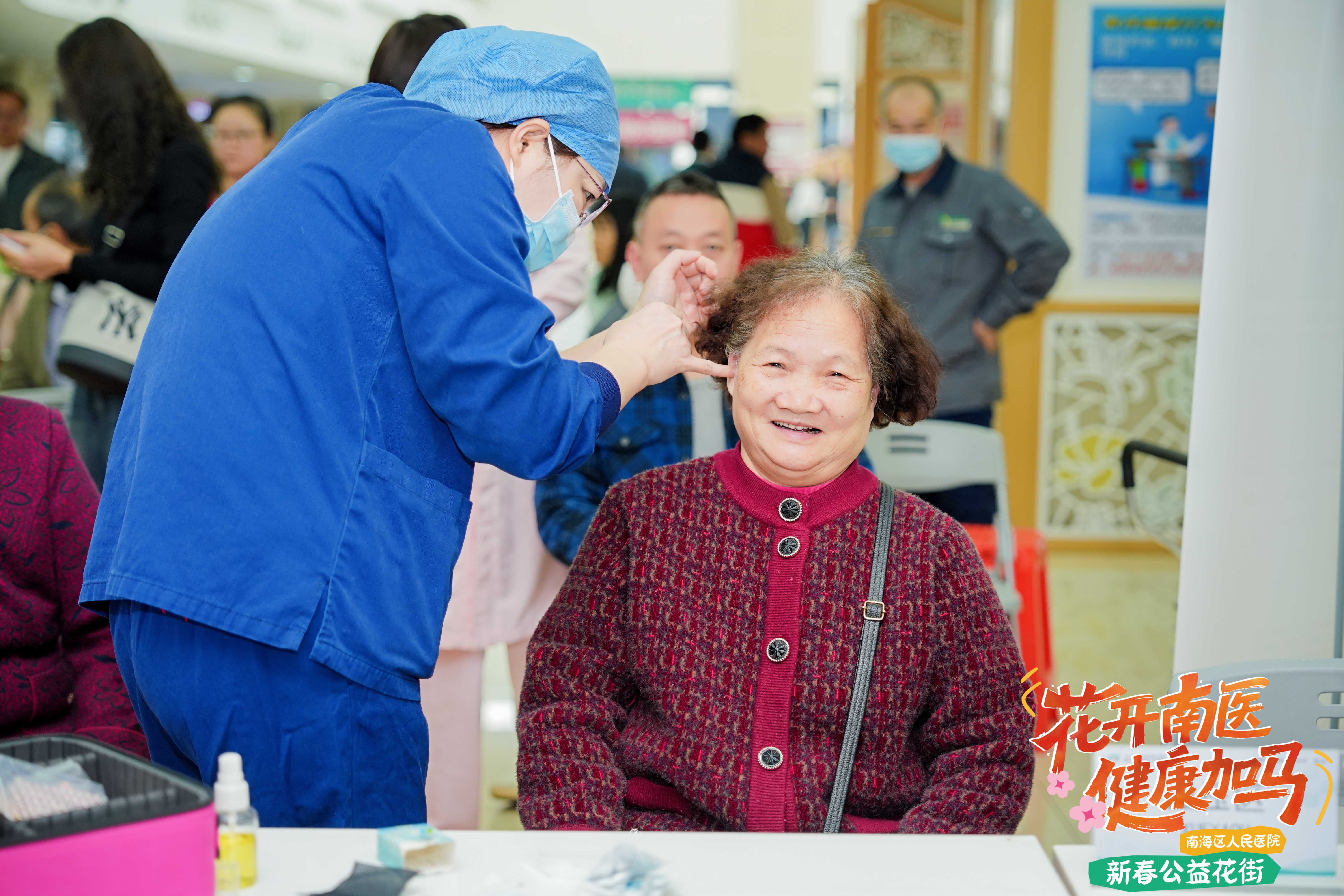 年货区集中展销各类南海优品好物,种类齐全,方便市民一站式采购。还有春联赠送、爱心义卖、药用植物与养生知识科普、耳穴体验、血压测量、养生茶点品尝等多项贴心便民服务,让市民在就医之余,也能感受到浓浓的新春氛围与人文关怀。