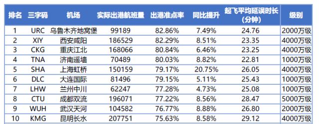 根据《报告》,乌鲁木齐地窝堡机场凭借82.86%的出港准点率成为年度千万级以上机场出港最准点的机场,准点率同比提升7.49%。西安咸阳、重庆江北机场分列第2、3位。