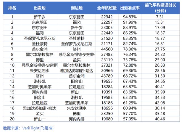 值得注意的是,2018年,全球热门航线排在首位的是新千岁-东京羽田,出港准点率达到94.83%,起飞平均延误时长仅为7.31分钟。东京羽田-福冈、东京羽田-新千岁分别位列第2、3,出港准点率分别为91.99%和88.91%,起飞延误时长平均为15.81分钟和17.09分钟。