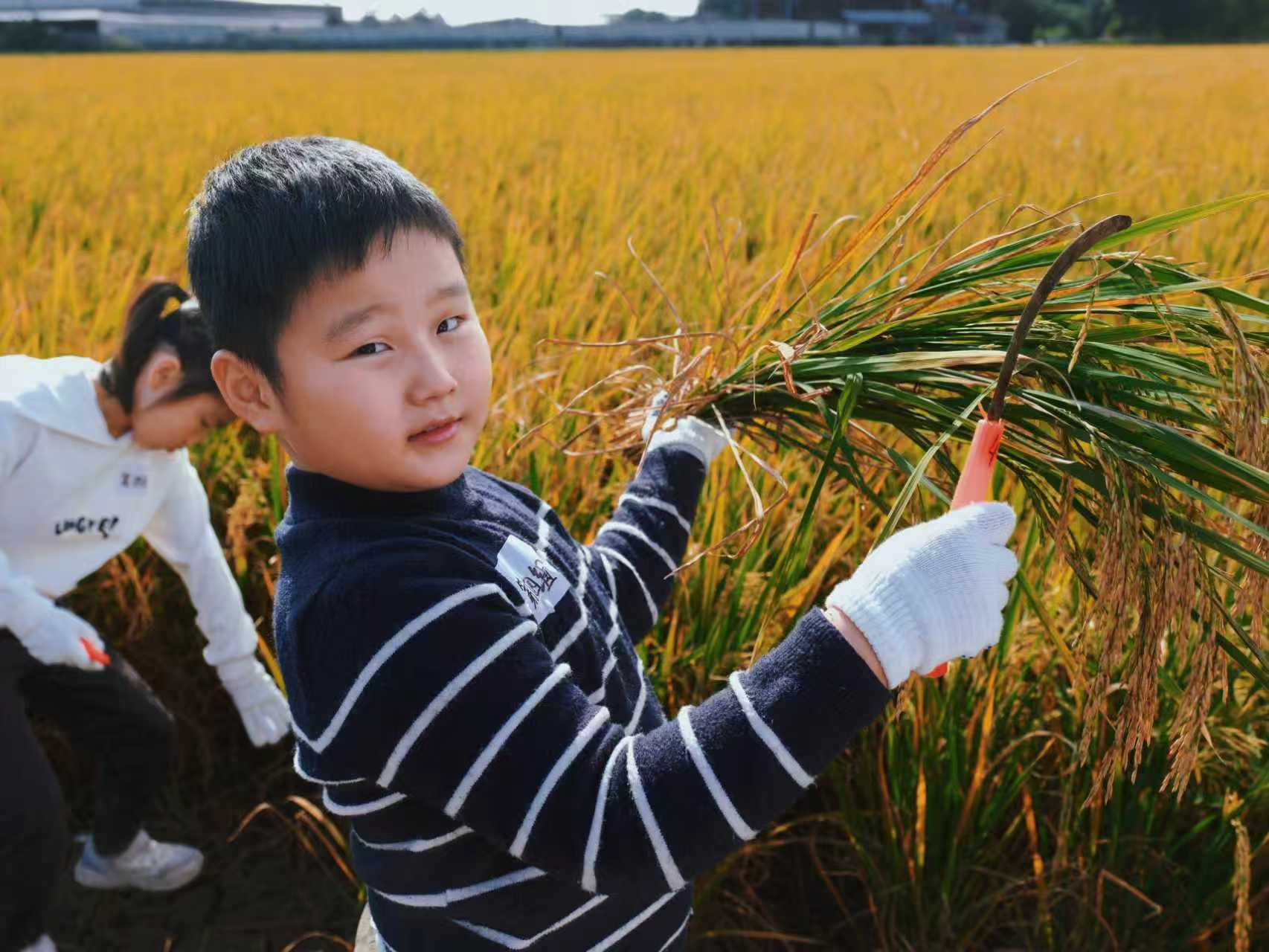 2025年九潭村党群志愿服务活动,小朋友在九潭“河南”稻田沉浸式体验收割。