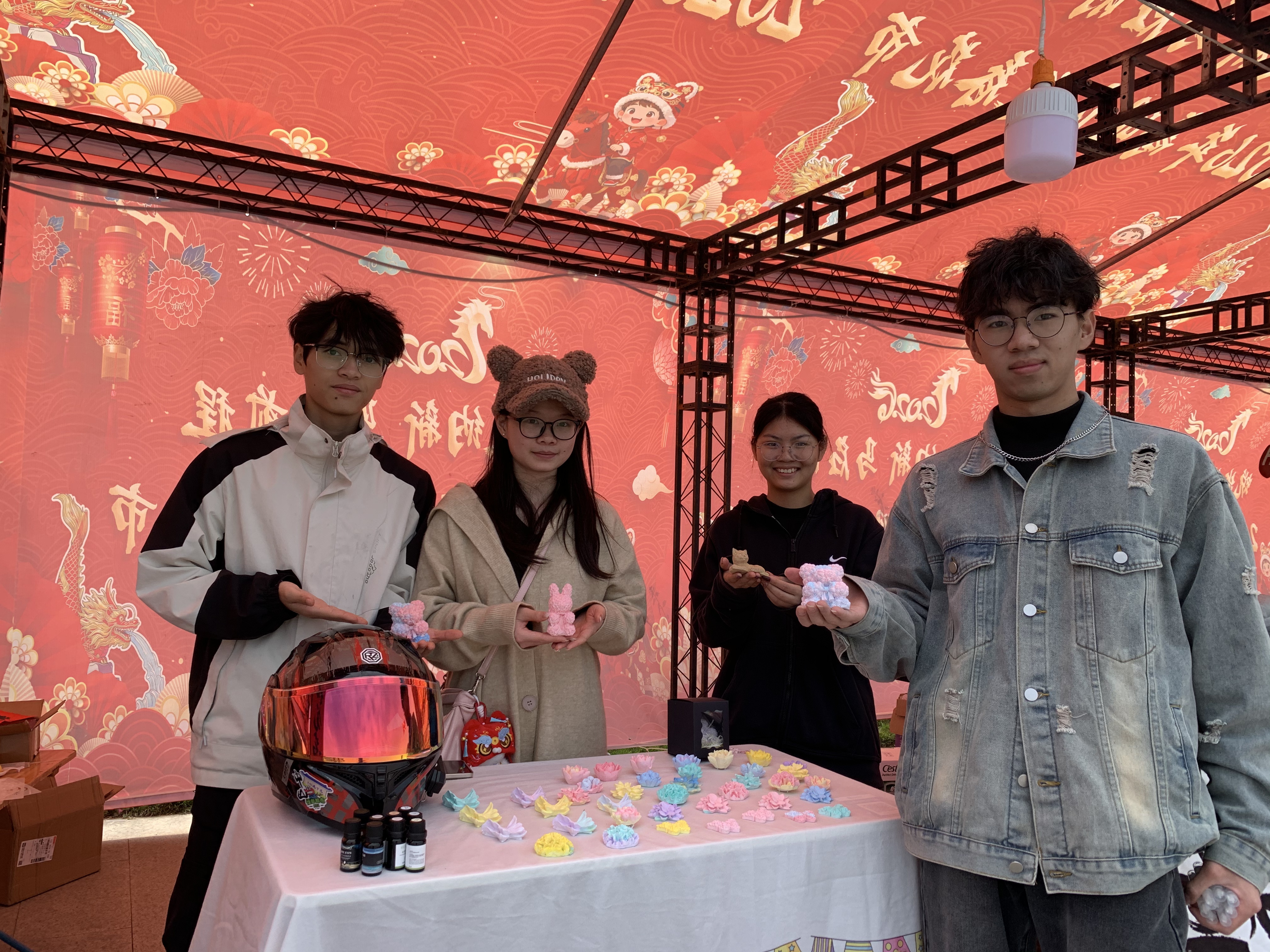 今年的大学生创意集市同样亮点突出,热缩片、香氛摆设创作、tufting 手工……各式潮流创意摊位带给孩子们新奇的游玩体验,孩子们发挥创意,亲手做出属于自己的新春文创作品。