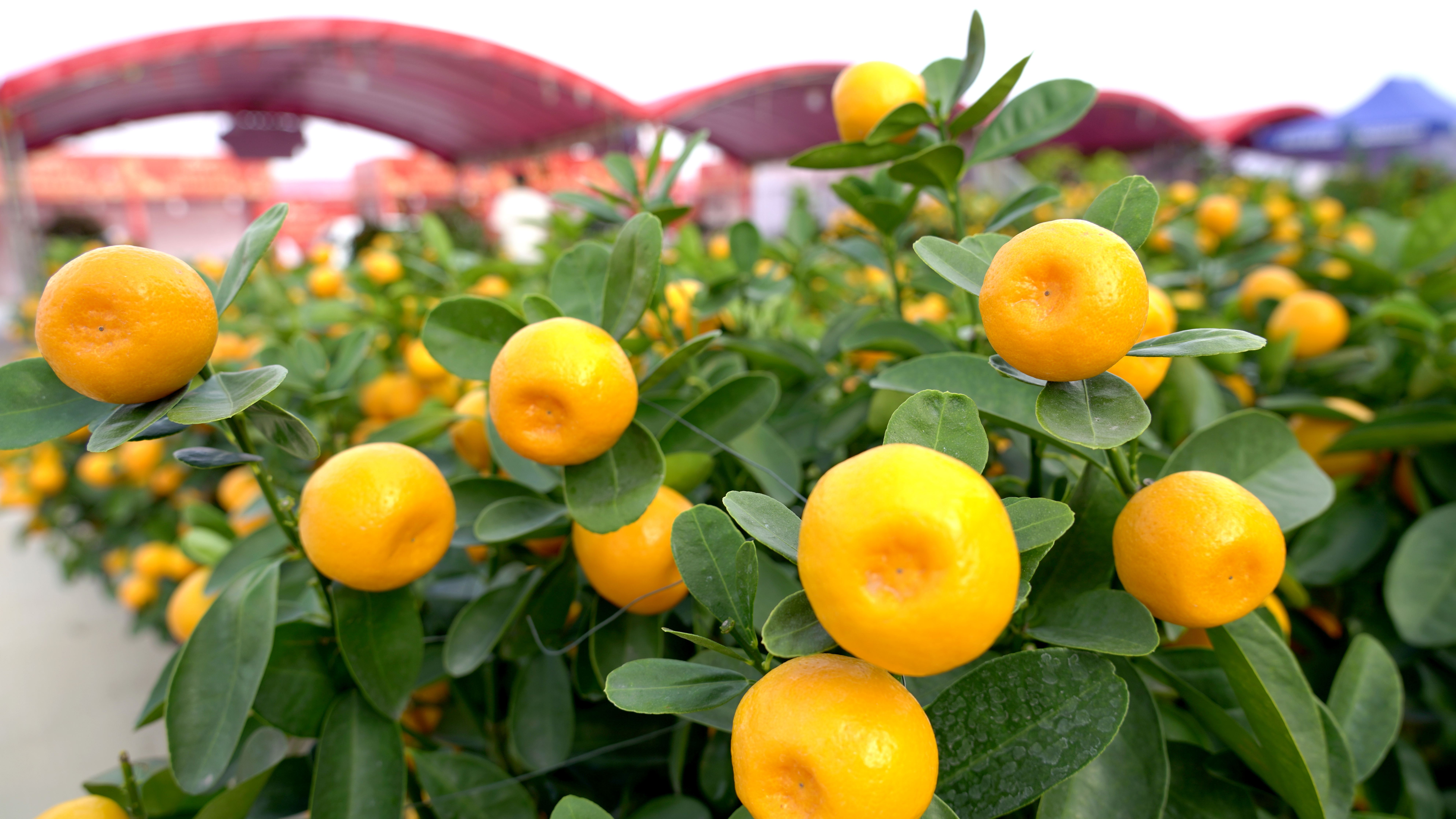年桔区内,一棵棵年桔枝繁叶茂,金黄果实挂满枝头,远远望去满目璀璨,不少市民携家带口前来挑选,仔细对比树形、果量,向档主询价交流,最终捧着心仪的年桔满意而归,把一整年的好彩头带回家。