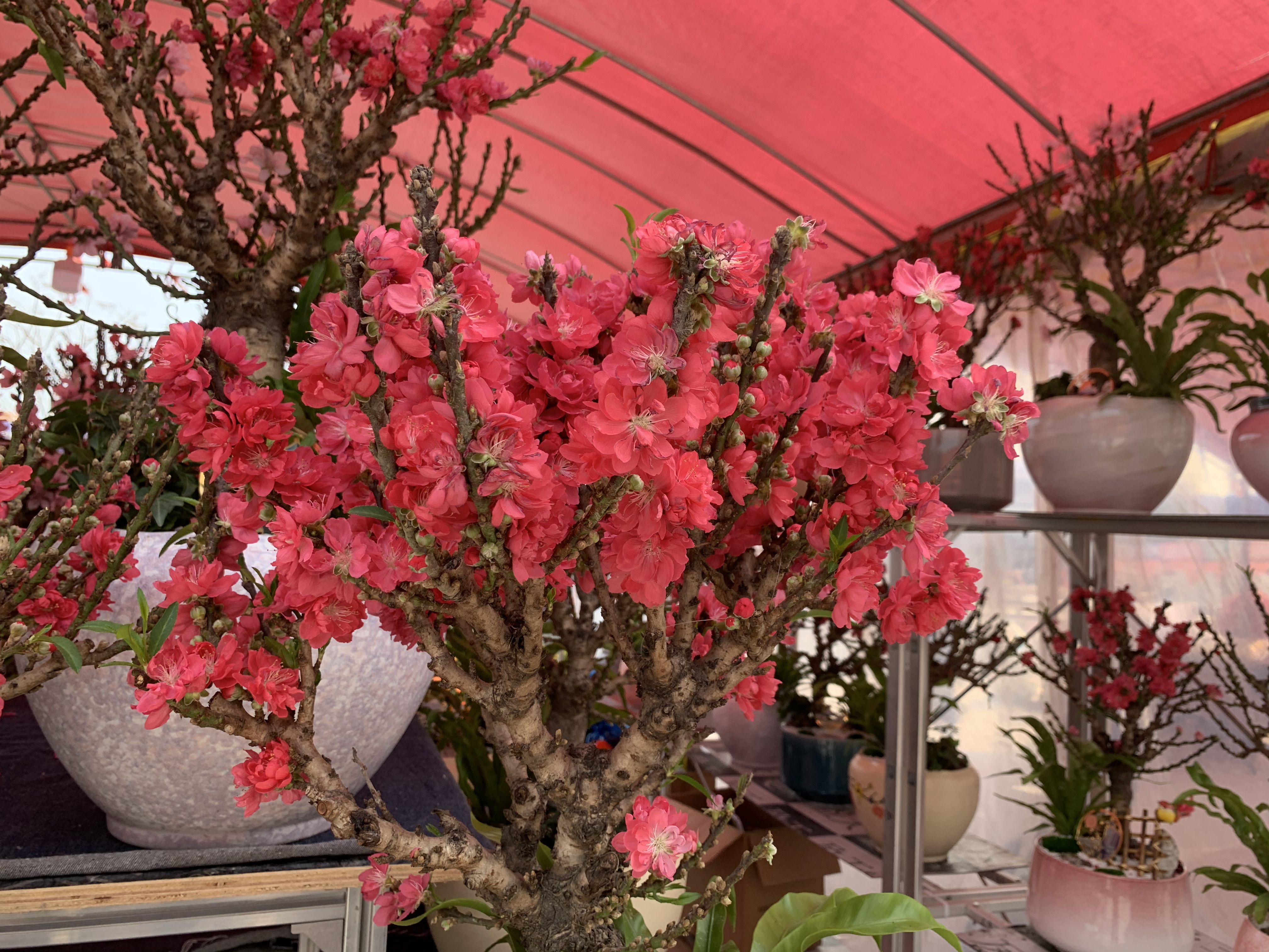 其中,年花区作为花市主角,汇成一片花的海洋。蝴蝶兰花形如蝶、姿态优雅,桃花红粉菲菲、灿若云霞,还有杜鹃、冬青、大花蕙兰、绣球花、丽格海棠、水仙、菊花……各色年宵花竞相绽放、品类繁多,现场还有造型别致的网红植物与盆景售卖。一辆辆满载鲜花的运输车忙着搬运,档主们细心修剪养护、热情招呼,现场一派繁忙又喜庆的景象。