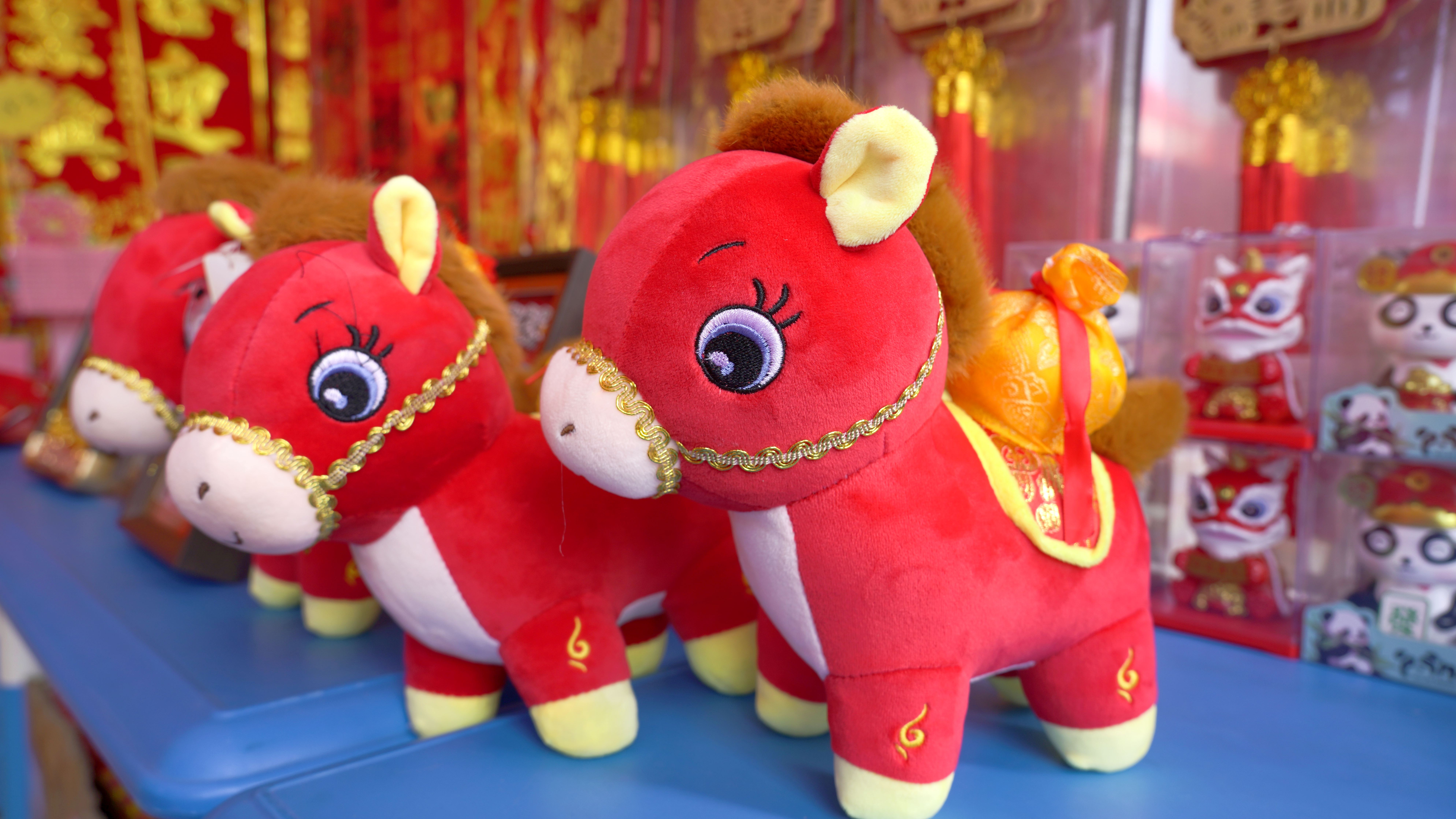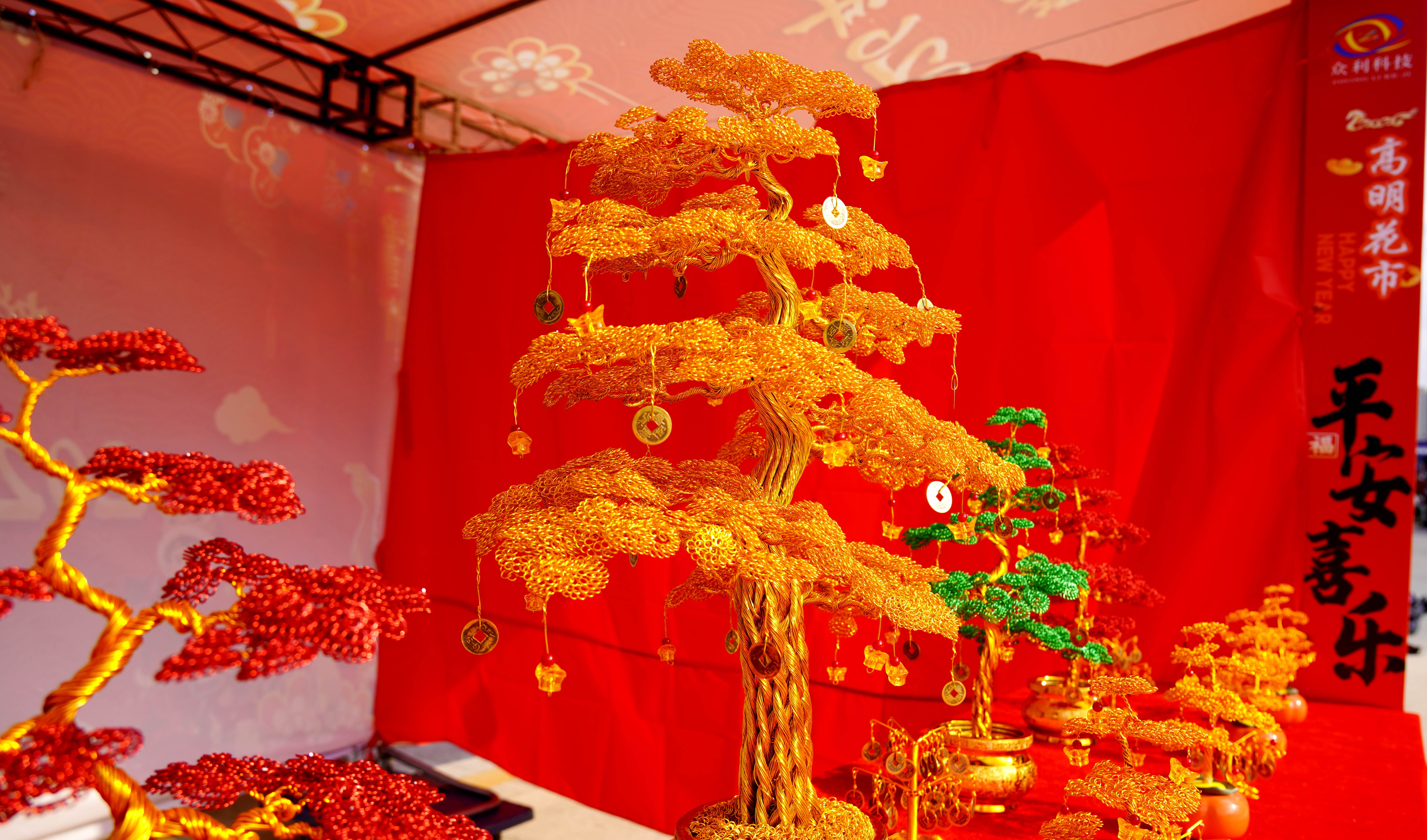 现场各个摊位同样年味十足。意外走红的“笑笑马”与“哭哭马”、吉祥如意的新春挂件、精致可爱的醒狮工艺品、金碧辉煌的发财树……各种造型喜庆、做工精致的商品琳琅满目,深受市民青睐。一些花艺档口还推出“马上发财”“马上花开”等年宵花创意组合,搭配新中式风格“马到成功”主题福桶,传统年味与新潮审美巧妙结合,既适合居家摆放,也是走亲访友的心意好物,吸引不少市民驻足挑选。