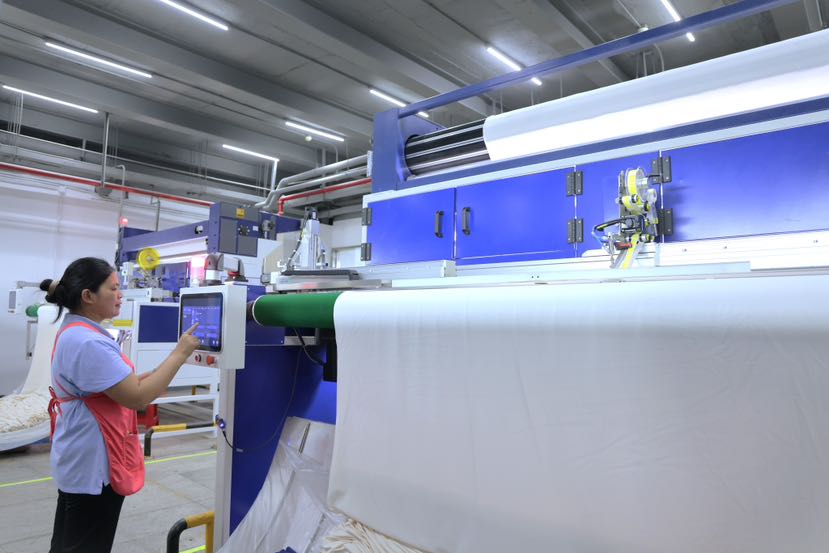 走进智能制衣车间,50余种自主研发的制衣自动化设备有序作业。通过与匡博智造合作,企业已形成覆盖裁剪、缝制、整烫的全流程解决方案,累计向行业输出超2000台设备。