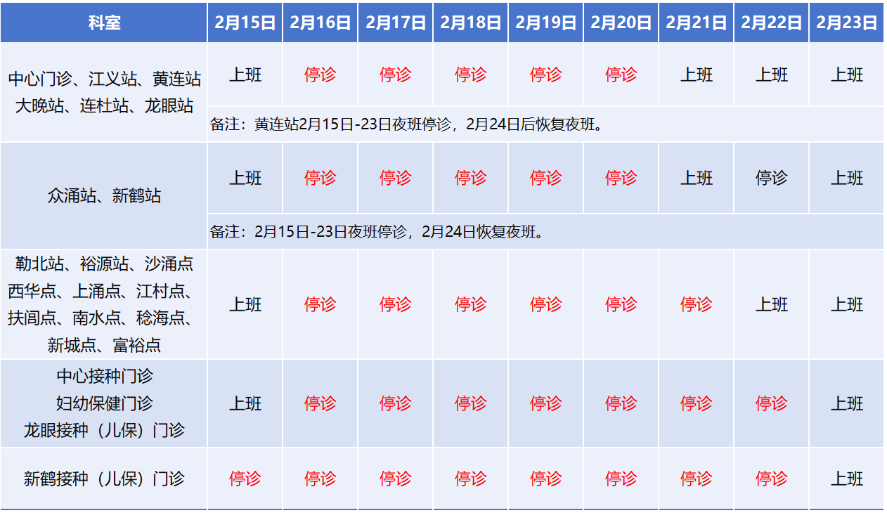 停诊站点预防接种门诊:2月15日至2月20日(年廿八至初四)停诊,2月21日(初五)起开诊。儿保科、其他各站点:2月15日至2月22日(年廿八至初六)停诊,2月23日(初七)起开诊。