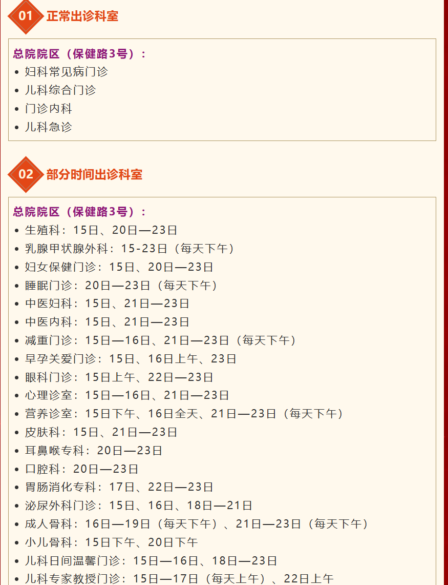 (二)儿科、妇科、中医科治未病科门诊2月15日(年二十八)至2月22日(初六)上午8:00-12:00,14:30-17:30开诊;2月23日(初七)起恢复夜间门诊。