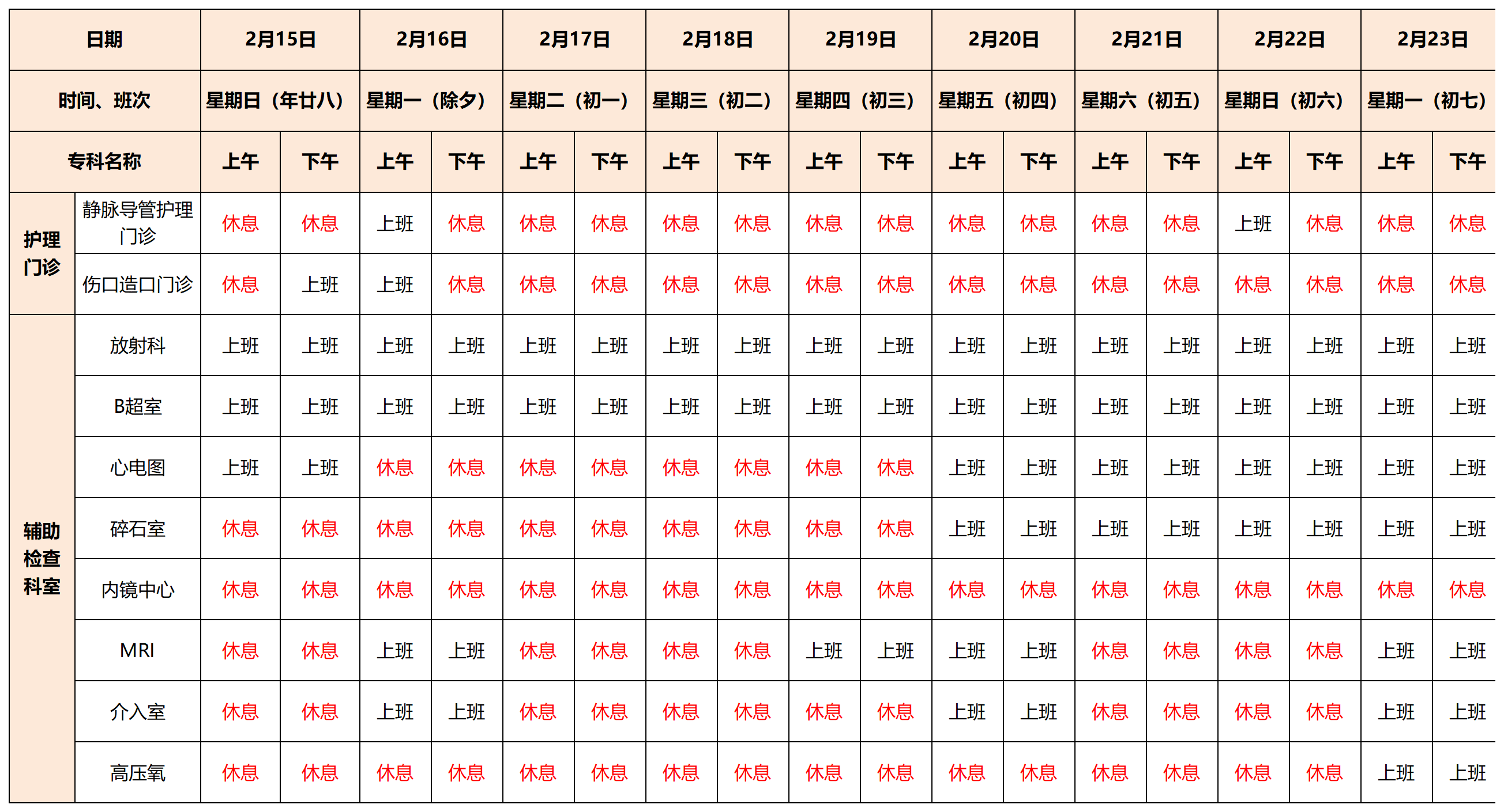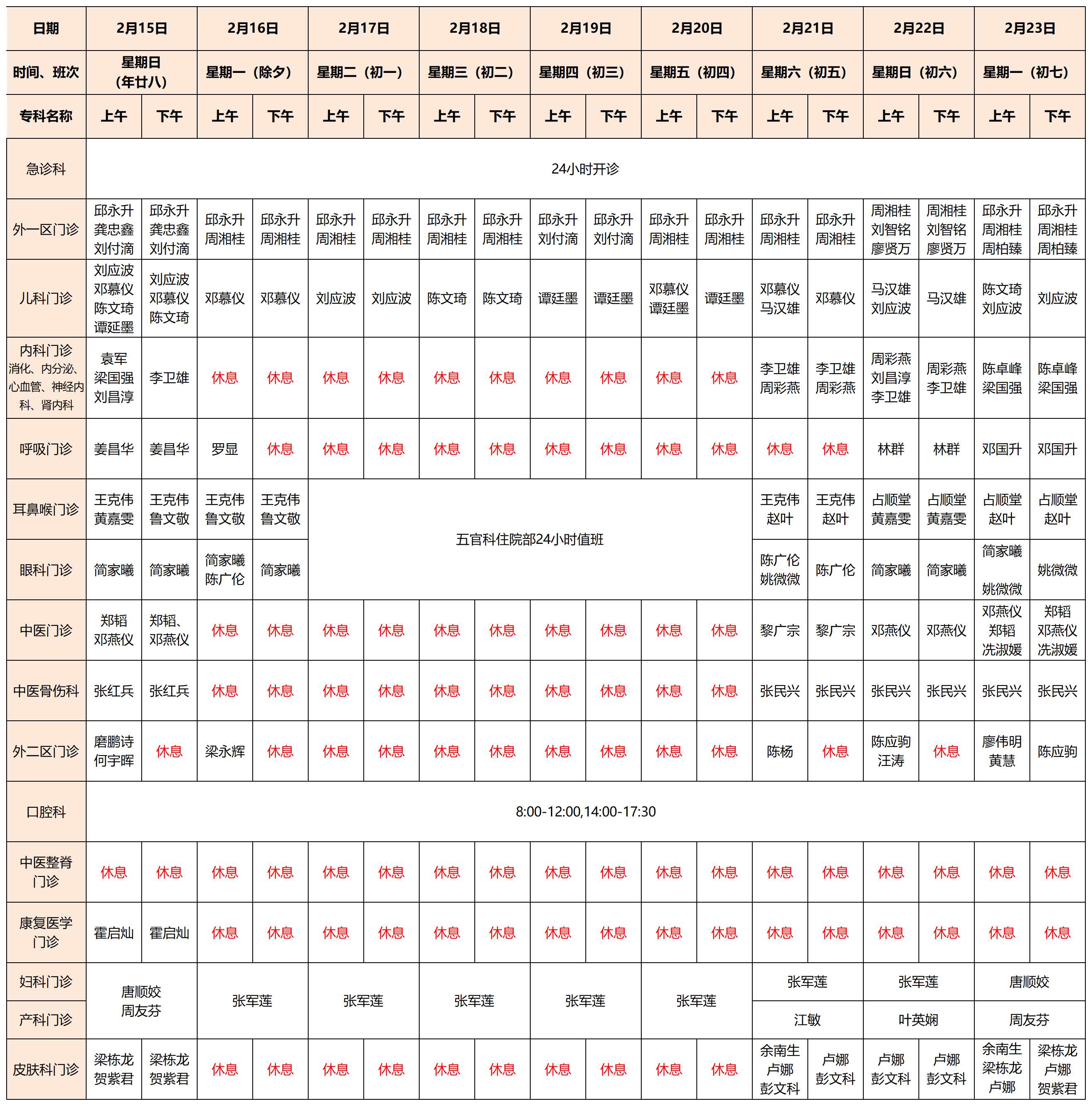 2月15日-2月23日按节假日排班安排医生出诊。