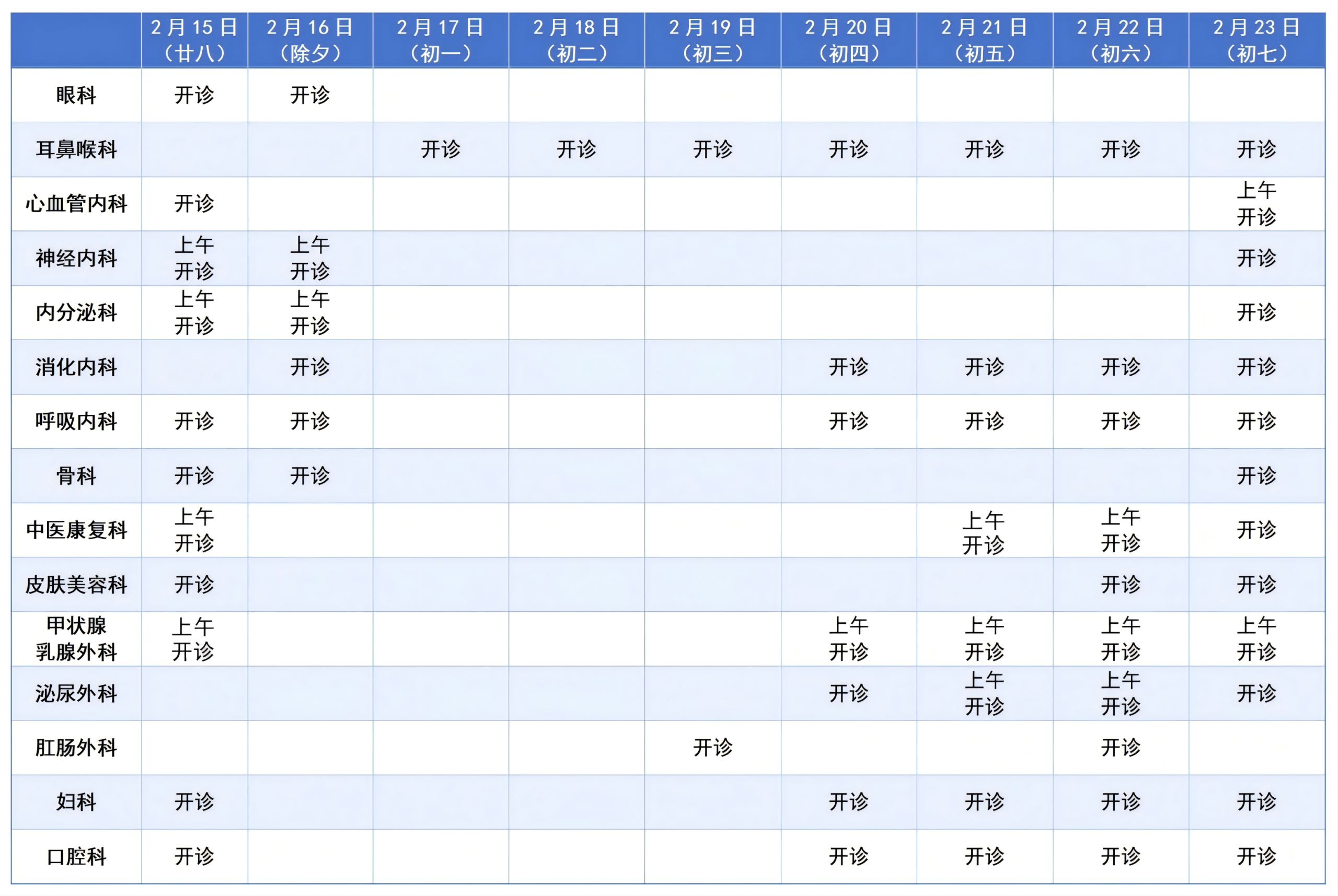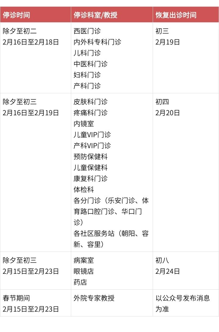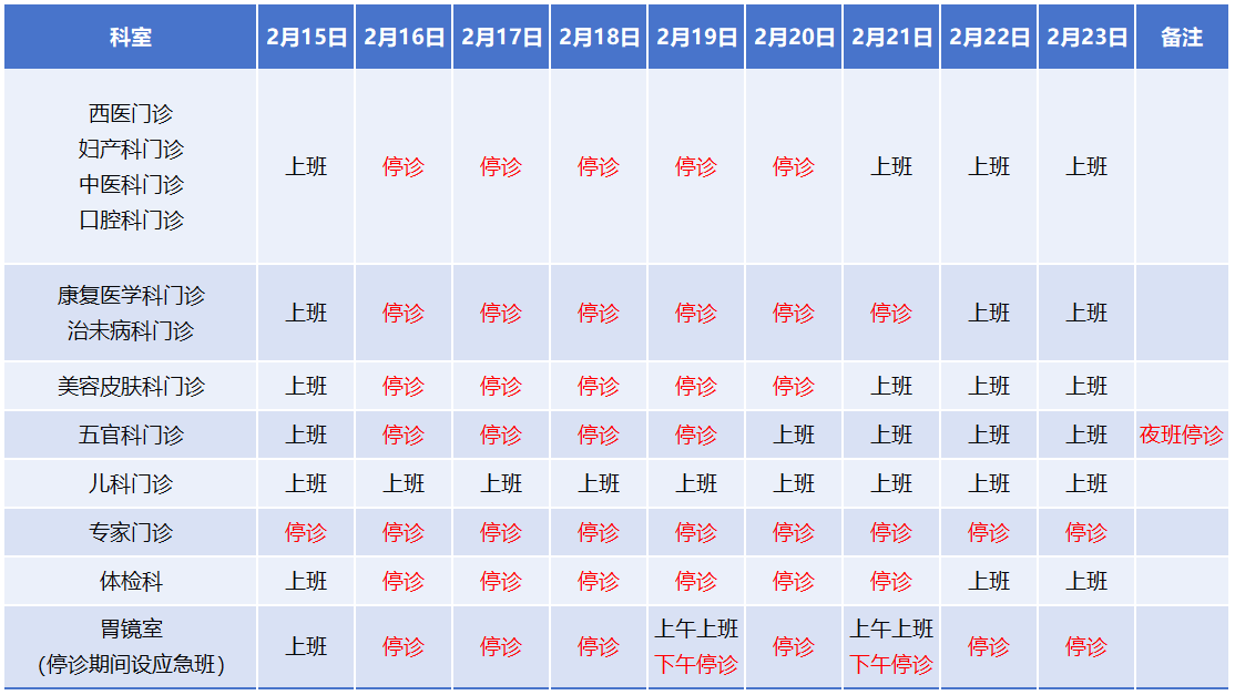 1.停诊时间:2月15日(年二十八)至2月22日(年初六)