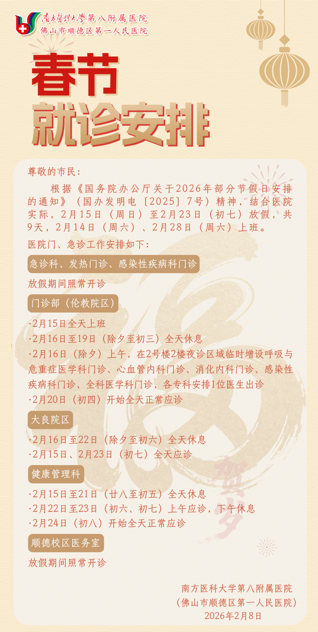 2026年春节期间,顺德卫健系统各大医院持续在线,全力保障市民健康及就医需要。现将顺德区内部分医院的就诊提醒整理如下,有需要的朋友可以提前收藏,合理安排就诊时间,平安过年!