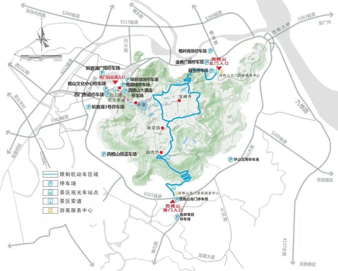 根据《佛山市南海区人民政府关于西樵山风景区限制机动车通行的通告》自2021年1月11日起,西樵山风景名胜区内实行限制机动车通行管理。西樵山景区周边设置有西樵山西门游客服务中心停车场、南门停车楼等多个停车点位,合共提供约8000个车位。