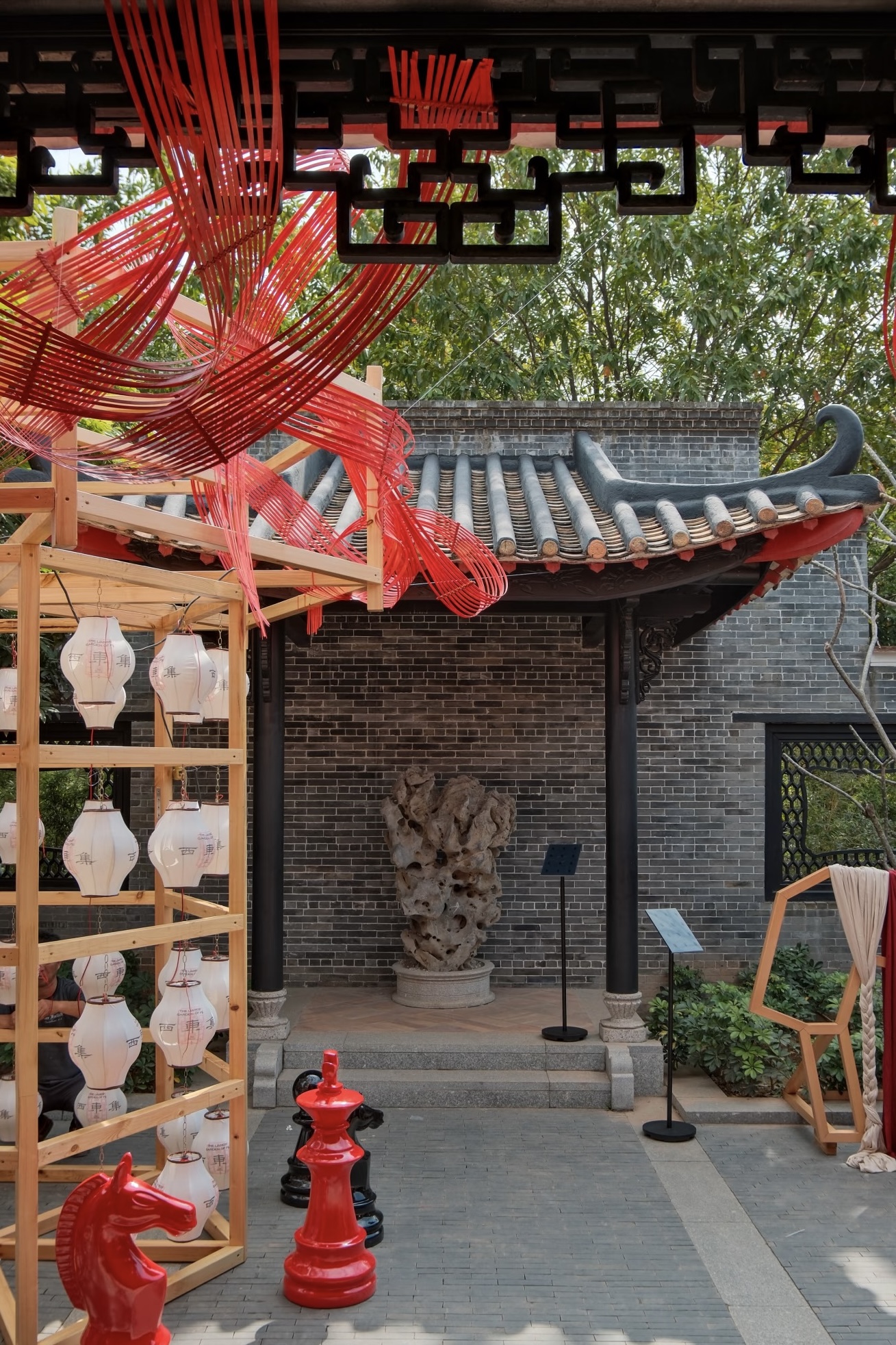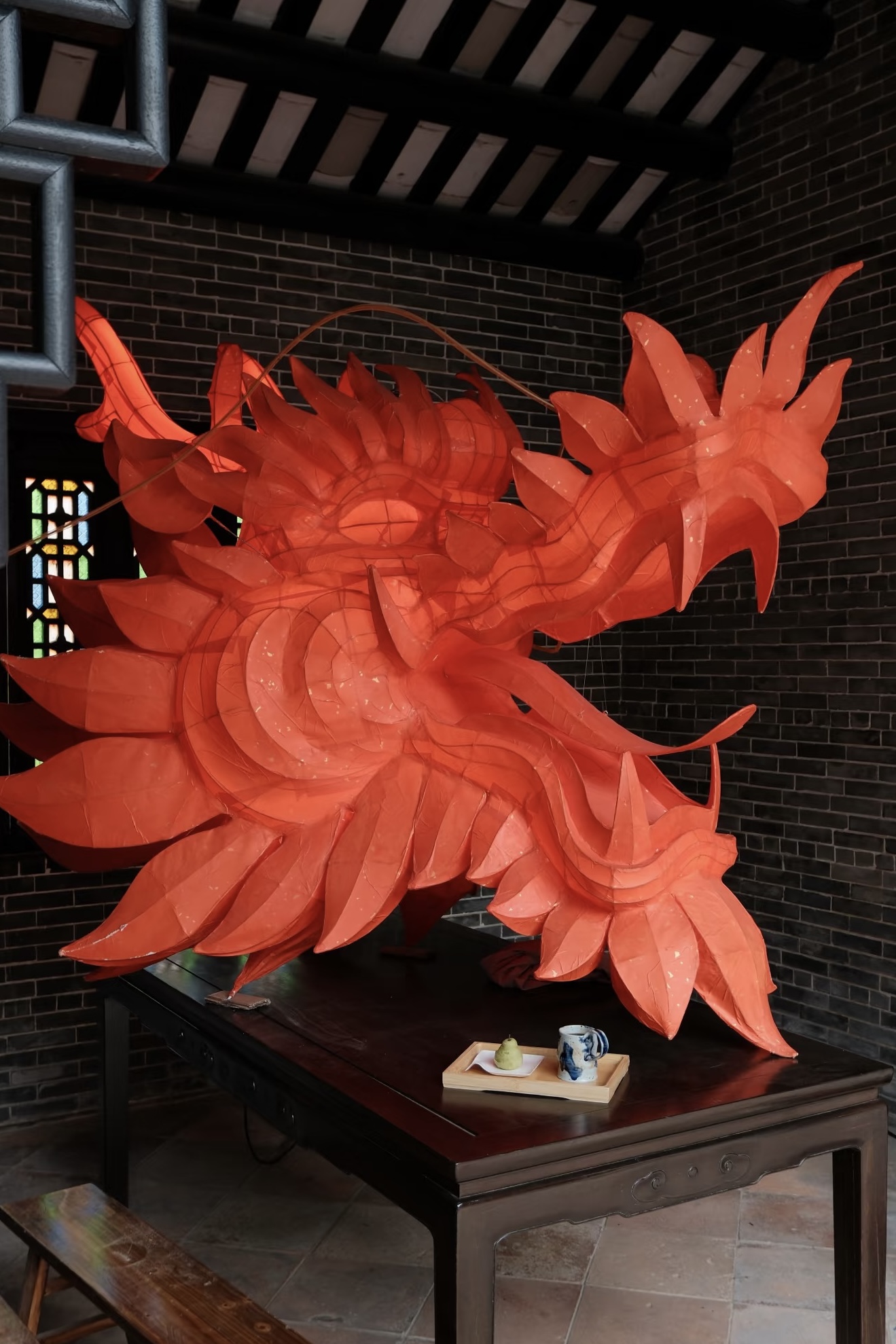 一进门就被非遗氛围拿捏,佛山彩灯非遗传承人李文涛大师的龙头彩灯坐镇,流光溢彩超吸睛;随处可见的竹编元素,既添东方艺术感,又温柔守护梁园古迹、保持舒适观赏距离,细节里全是用心