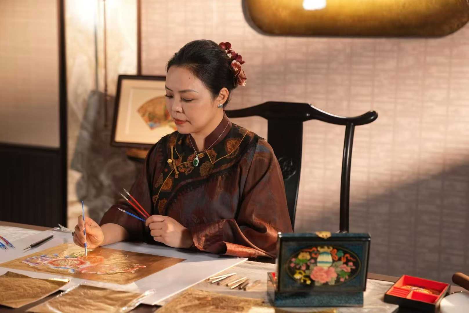 创新上,我改用纯999黄金制作铜凿剪纸,解决传统铜料氧化问题;借鉴西藏唐卡石粉色与油画色,实现作品千年不掉色;独创前后立体敲凿手法,让作品立体感十足,被誉为剪纸界天花板。