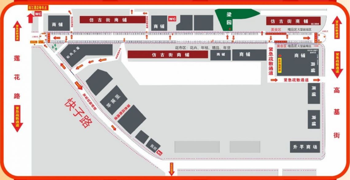 今年花街共设超300个摊位,涵盖设置年花盆桔、精品年货、创意市集、特色美食、游乐区等丰富业态。
