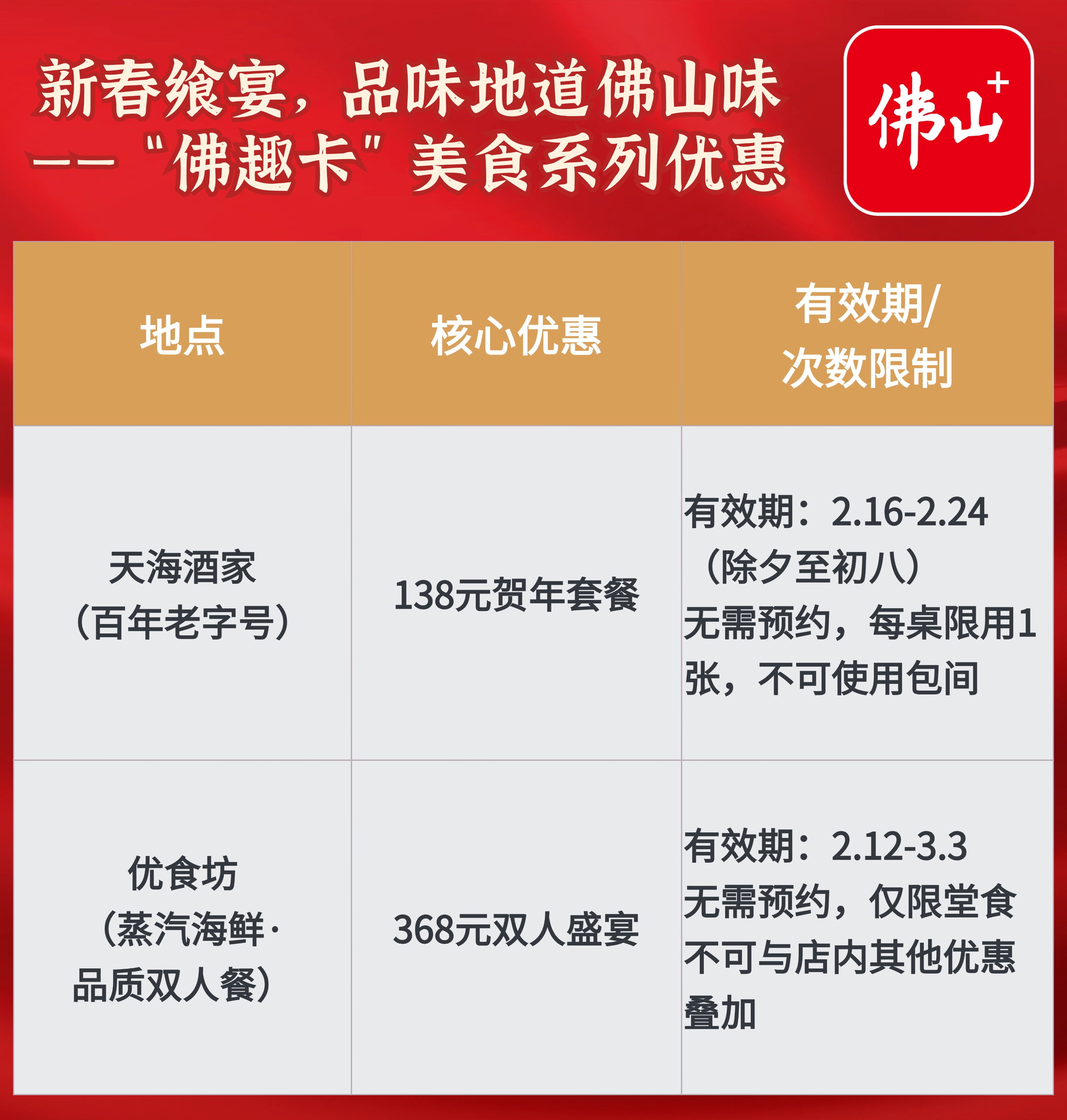 无论是承载几代佛山人记忆的“天海”,还是主打原汁原味的蒸汽海鲜“优食坊”,这两款新春限定套餐都已在佛趣游平台上线。动动手指提前锁定,到店核销即可尽享美味。春节家庭大餐、朋友小聚,总有一桌好菜等着你。