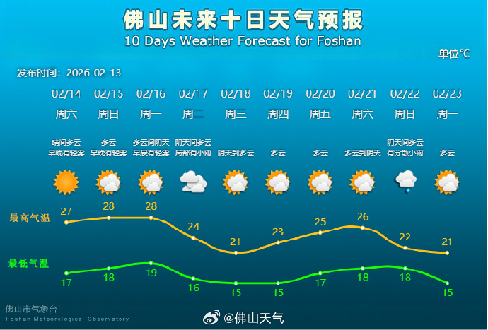 除夕(2月16号)多云间晴天,早晨有轻雾,最高气温28度,最低气温19度。