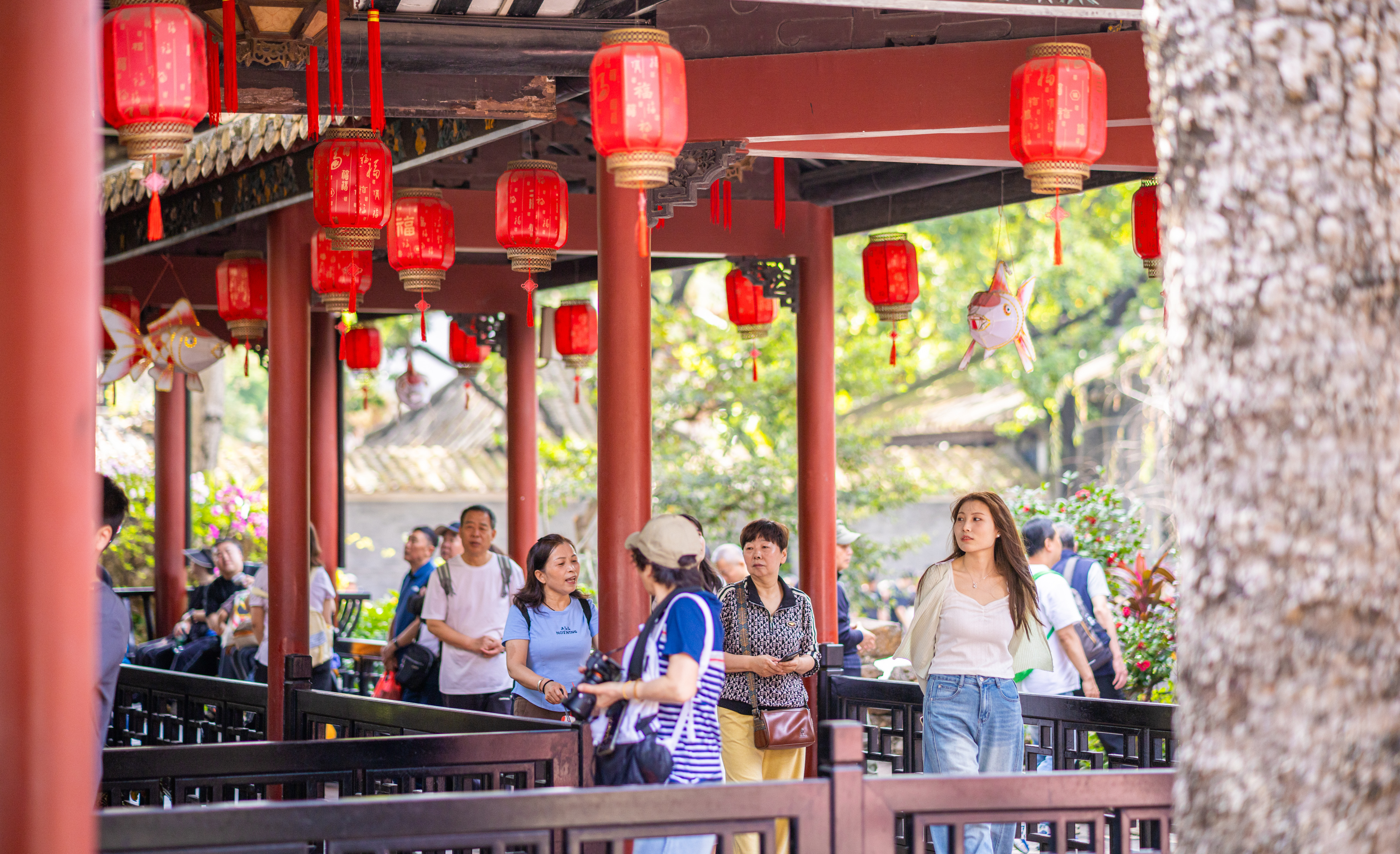 14:56,马年春节将近,清晖园博物馆张灯结彩,年花年桔在园区内增添节日气氛,廊道挂上大红灯笼以及鱼灯。截至16上午11时许,顺德清晖园博物馆单日入园人数已超4000人。同时,清晖园博物馆将在大年初一至初六开放前园广场夜游活动。