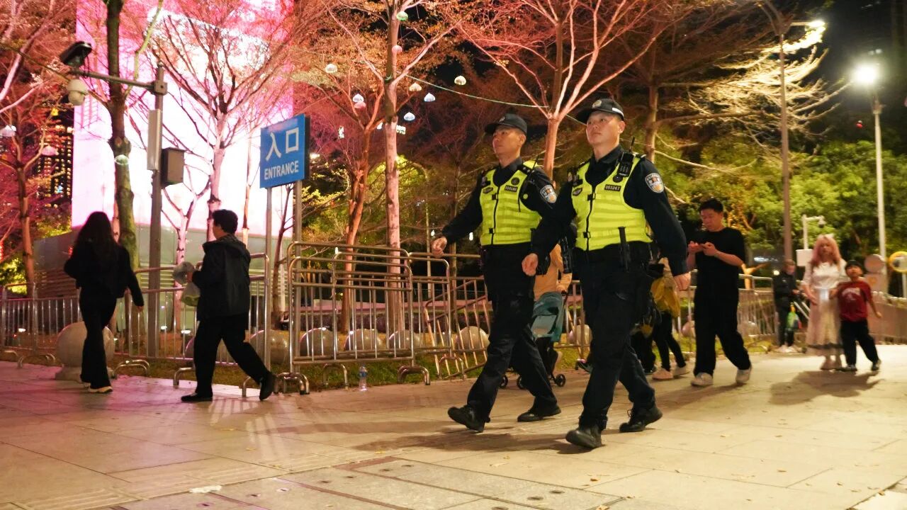 夜幕降临,华灯初上。位于深圳市民中心一带的灯光秀准时亮起,流光溢彩,映照着人们的笑脸。春节假期,这里每天都有表演,客流、人流比平日多出好几倍。人群外围,一支巡逻队伍正在默默巡逻守护。深圳市公安局福田分局机训大队巡特警中队民警李文强走在队列前侧,目光不时扫过广场入口、临时围栏和周边道路。