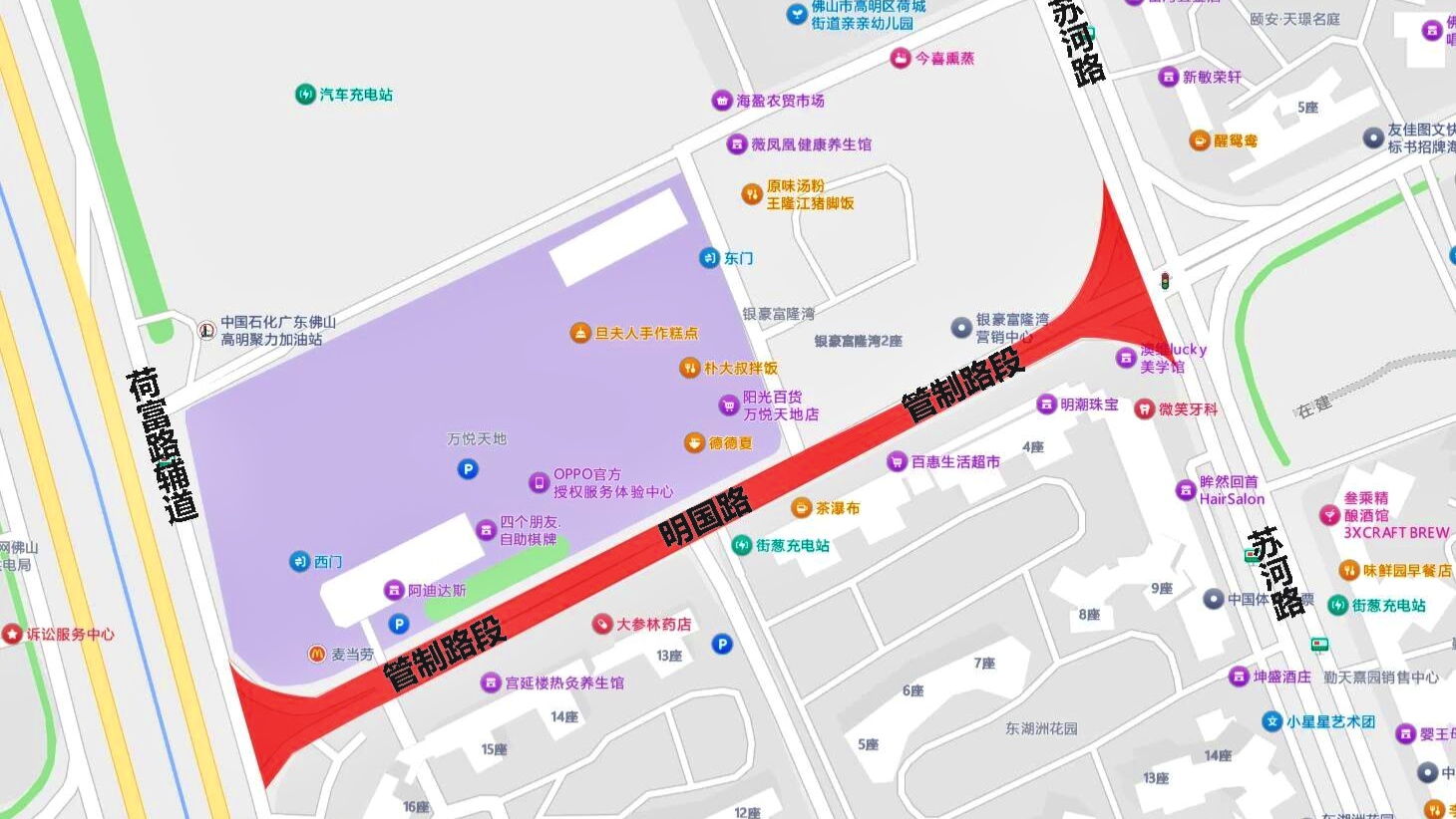 高明区交管部门也发布交通管制通告:2月18日21:00起,明国路(荷富路辅道至苏河路)实施临时管制,禁止社会车辆进入,路段内车辆可正常驶离;2月19日8:00起至活动结束,管制路段内禁止车辆启动,请市民提前挪车,配合现场管理。