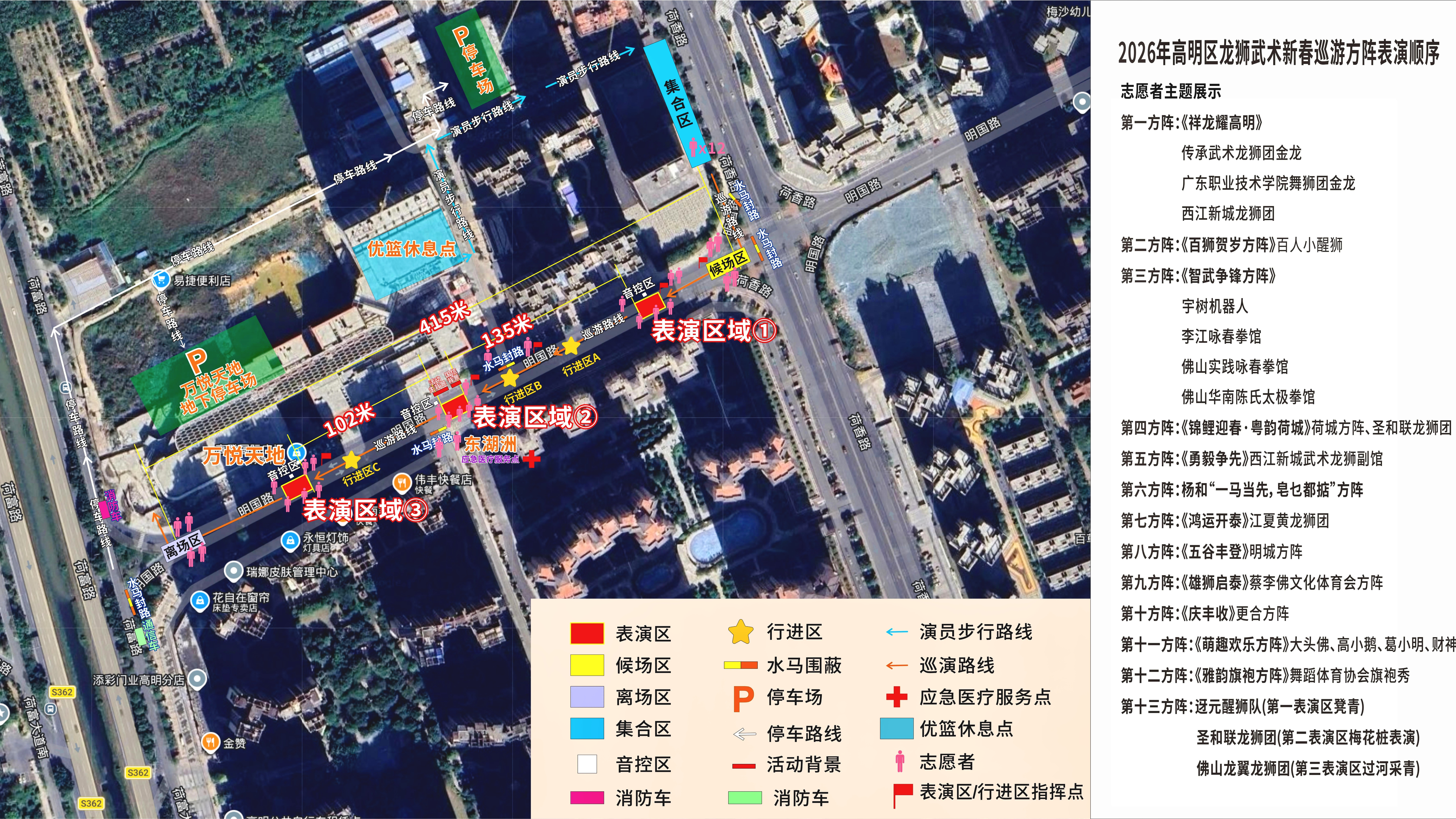 本次巡游采取封闭巡演形式,明国路(荷富路辅道至苏河路)作为核心路段,将化身非遗展示长廊。巡游阵容亮点纷呈,金龙、醒狮、武术、旗袍秀及镇街“百千万工程”特色方阵依次沿街行进,尽显高明城乡发展新貌与传统文化魅力。百人小醒狮萌态可掬,宇树机器人表演科技感拉满,武术高手轮番献技;凳青、梅花桩、过河采青等高难度醒狮绝技逐一呈现,传统技艺与新春喜庆相融,带来震撼视觉体验。