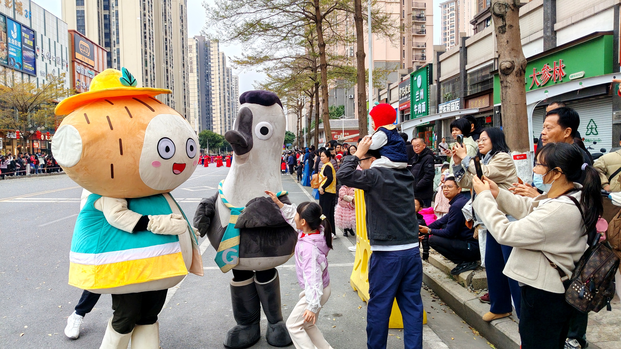 “我们从江苏过来广东,本来打算去其他地方看灯会,后来听说高明的龙狮巡游更有年味,就临时改道了。”江苏游客石大爷和王阿姨一边在“雅韵旗袍方阵”前拍照,一边感慨,“昨晚临时来到高明,没想到这里这么有味道!粤剧萌娃、旗袍走秀,岭南风情太浓了。我们还准备买几份‘高小鹅’‘葛小明’的文创礼盒送朋友。”