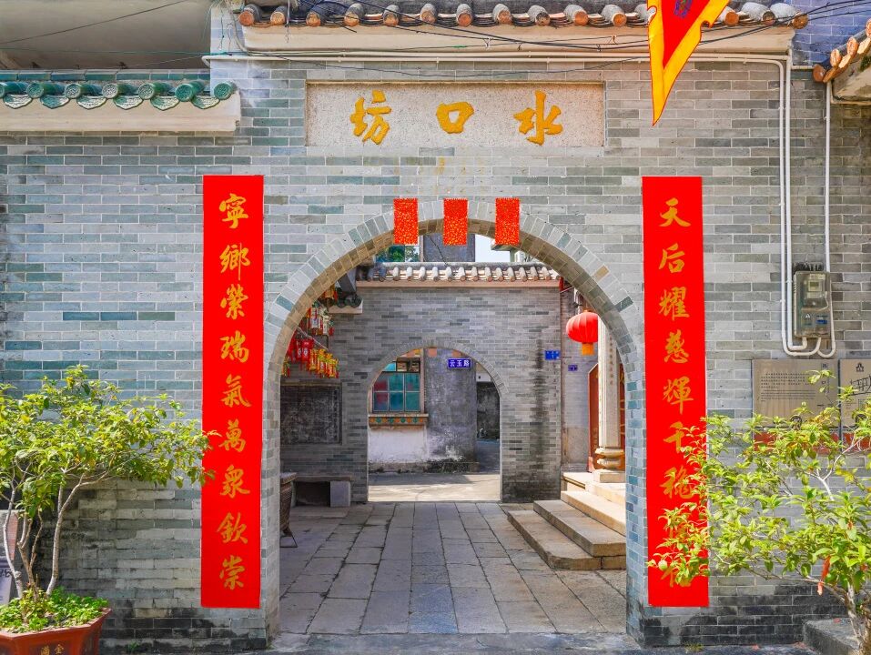 ✅ 天后古庙(天后宫):位于水口坊(马东村中心地带),始建于清乾隆年间,香火旺盛。古庙坐北向南,三间两进,青砖墙麻石脚,头门前廊梁上的戏曲木雕、石门额上的“天后宫”楷书大字、石楹联上的瑞兽纹饰,无不彰显着古建的精致;墙楣上民国杨少泉绘制的“夜游赤壁”等壁画,色彩依旧鲜亮,极具艺术价值。