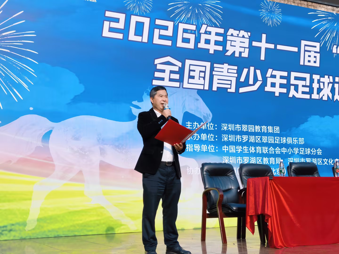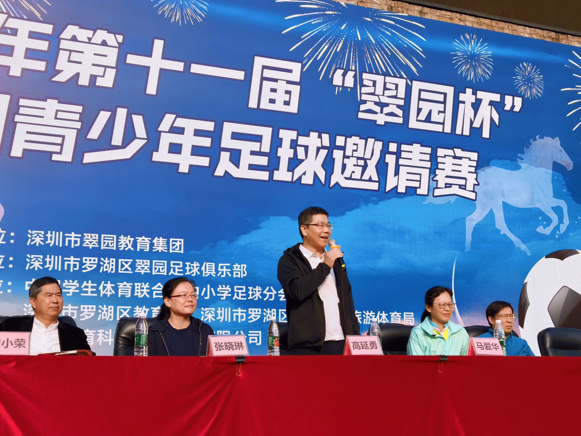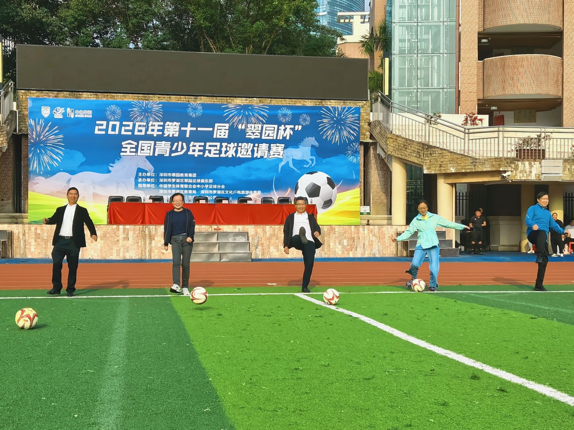 罗湖区委教育工委书记、区教育局党组书记高延勇宣布2026年第十一届“翠园杯”全国青少年足球邀请赛正式开幕。出席开幕式的领导嘉宾共同移步球场中央,为比赛开球,标志着本届赛事正式拉开战幕。